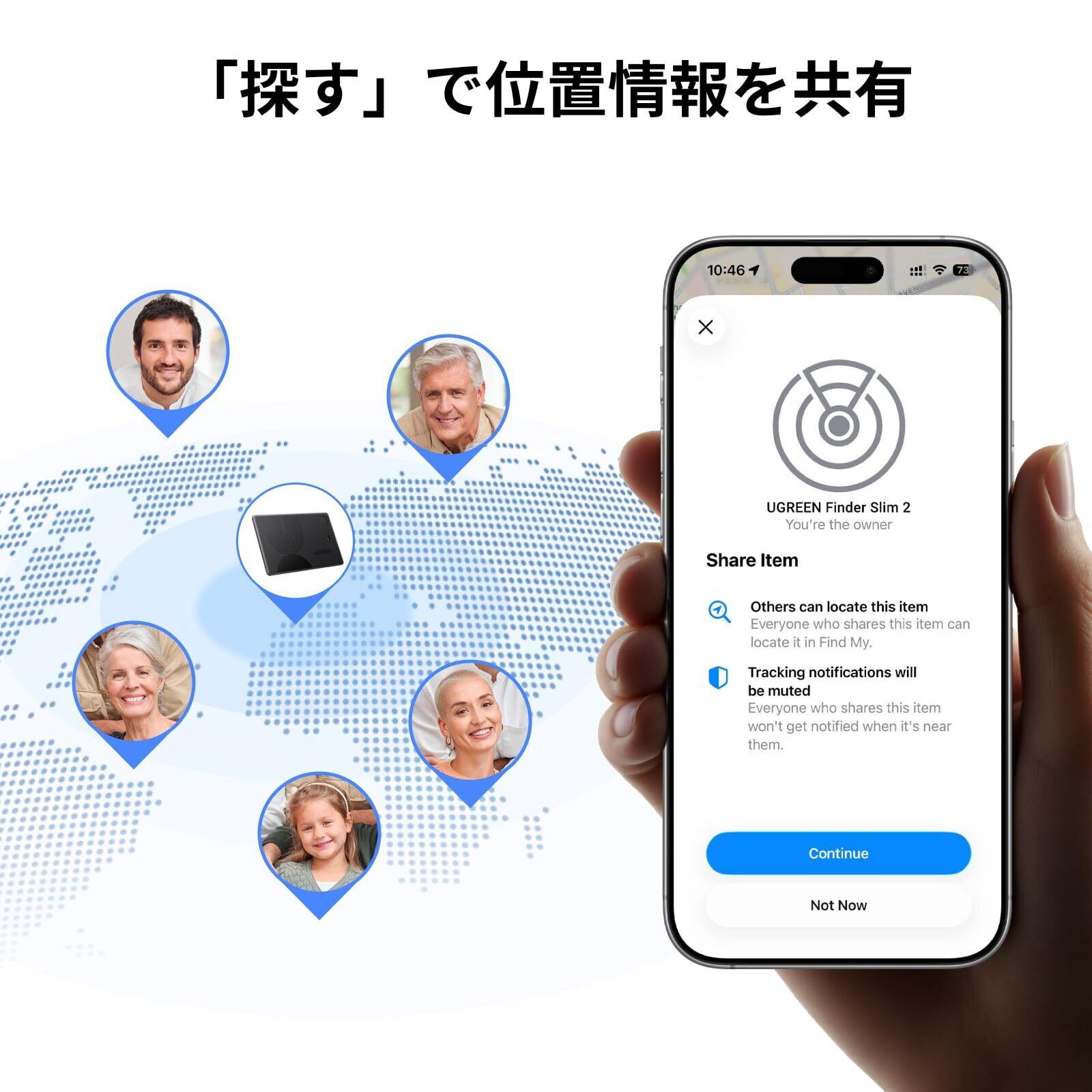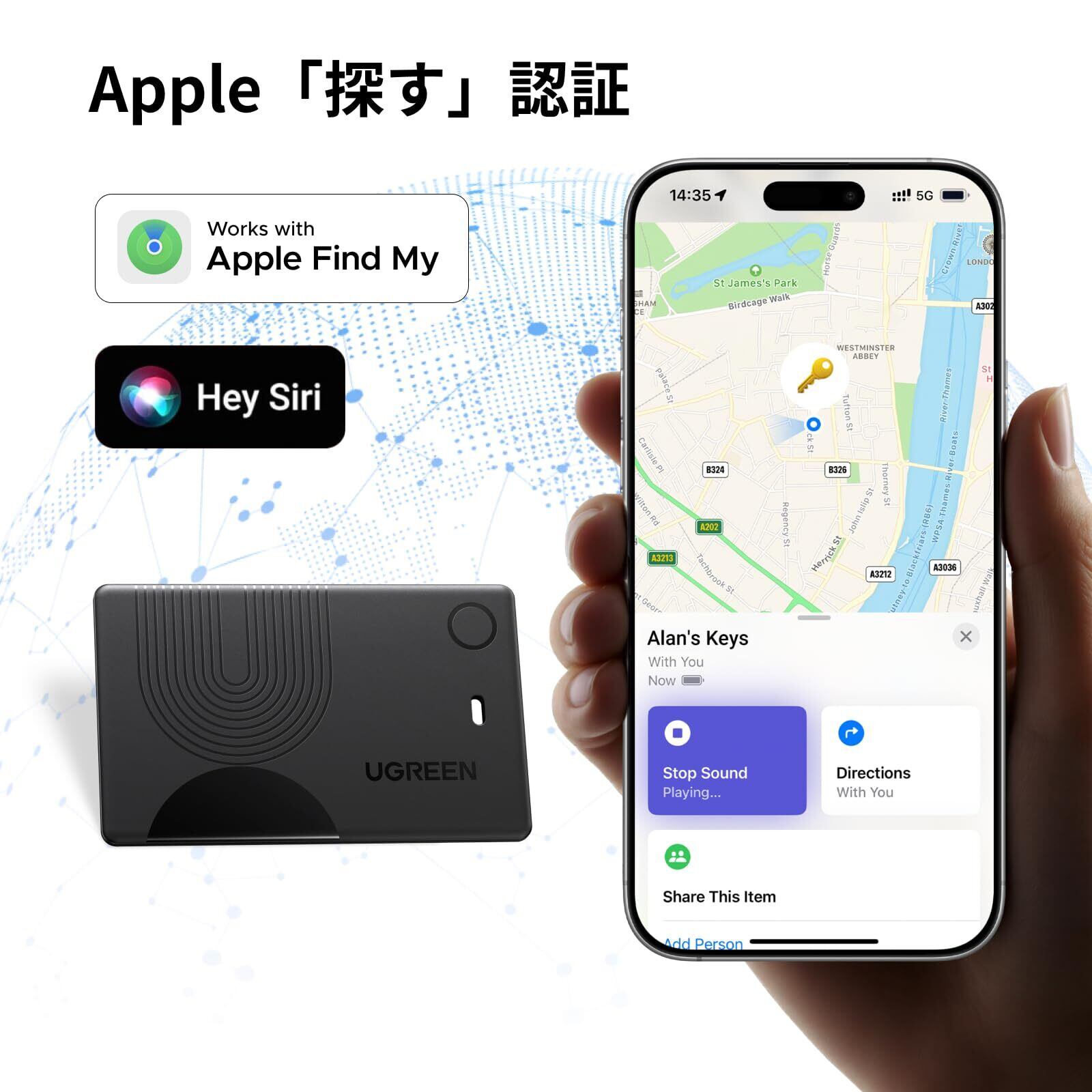 【Apple「探す」認証(iOS専用)】:UGREENウォレットトラッカーカードはAppleの「探す」認証を取得しており、インストール不要で、内蔵のiOS「探す」アプリを使用して接続します。