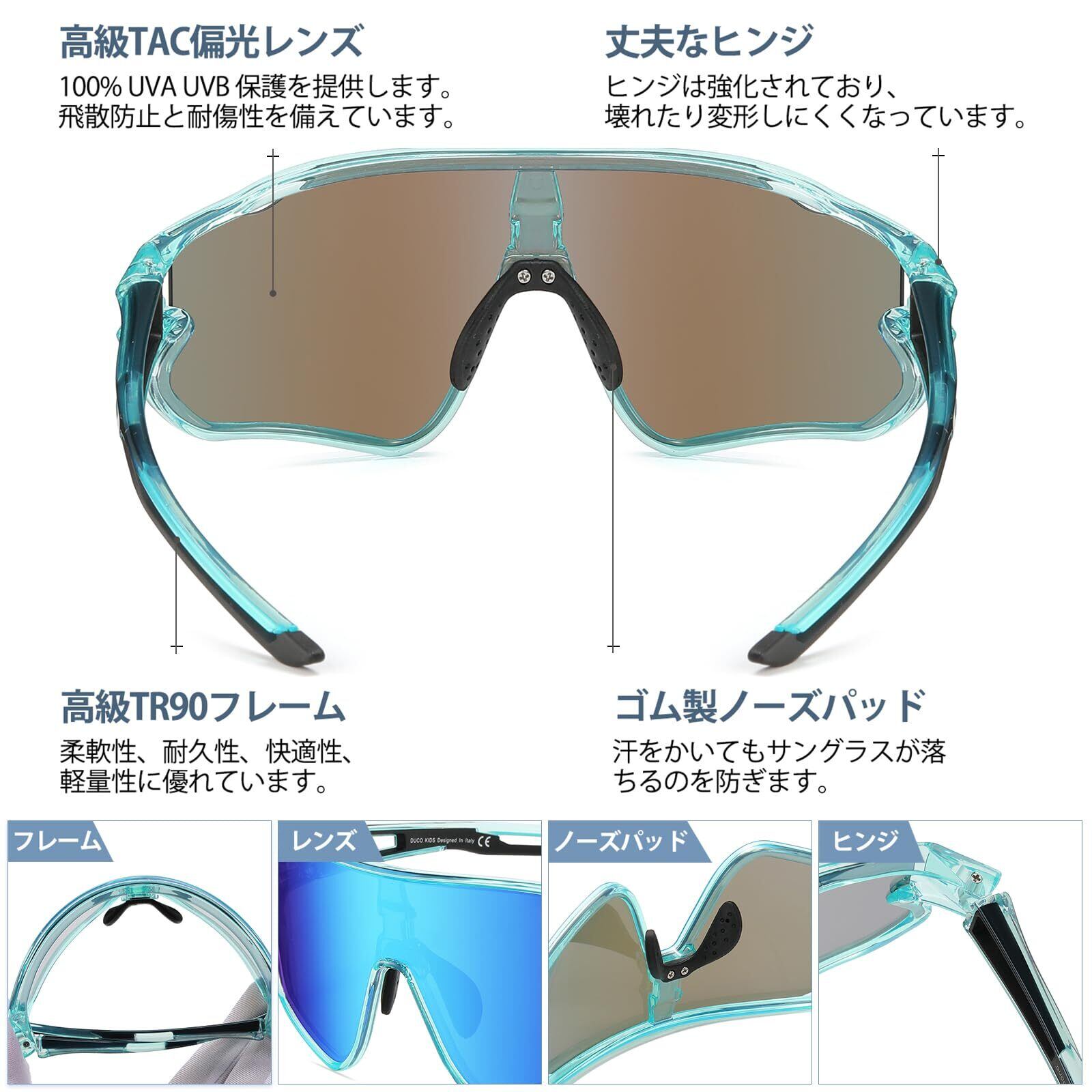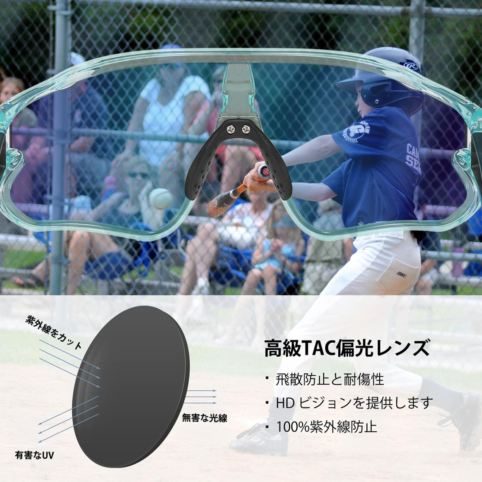 100%UVカットレンズを使用しており、紫外線から子供の目を保護します。長時間の屋外活動や野球の試合中でも、眩しさや光の反射を軽減します。