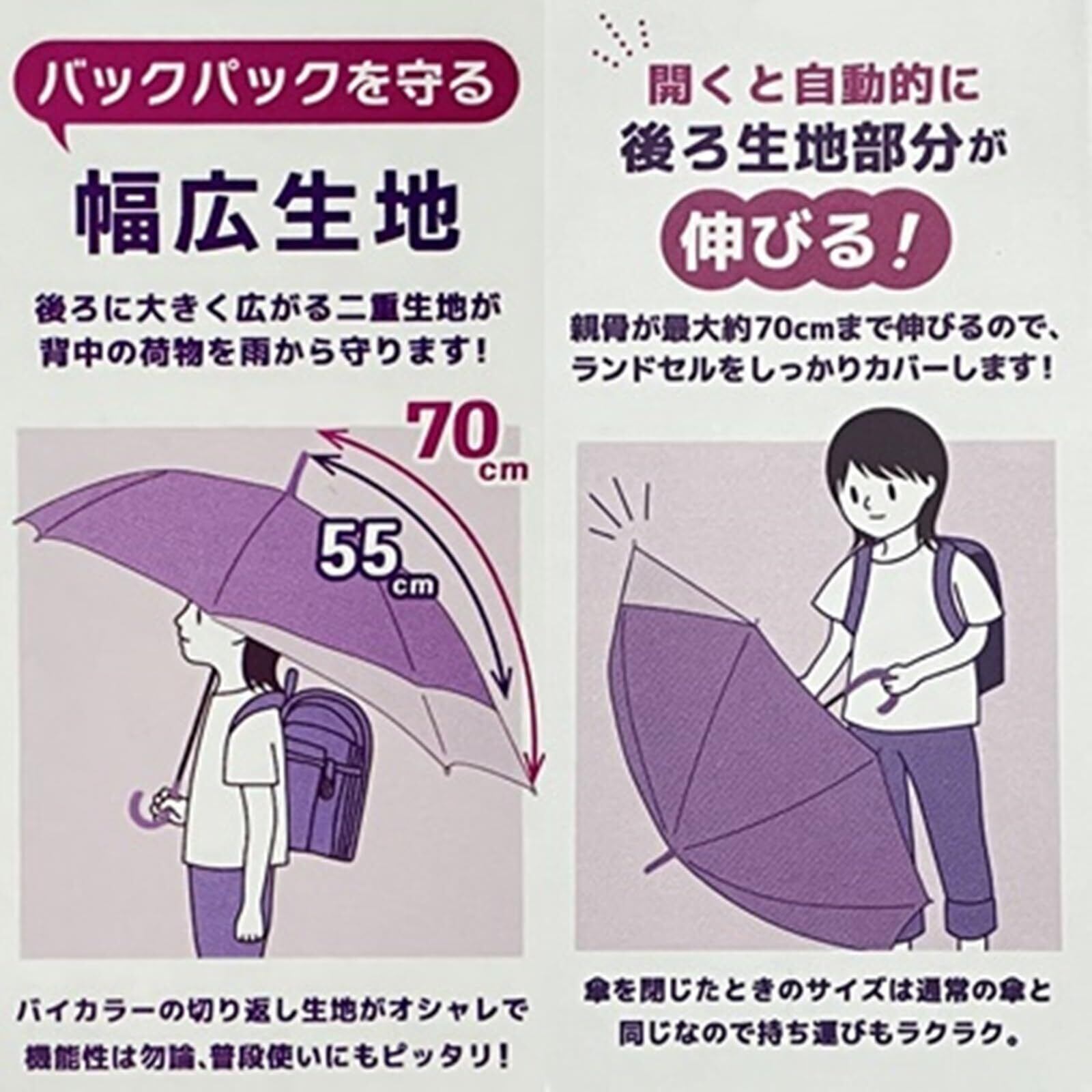 特殊骨構造でバッグガード: 傘を開くと後ろに大きく広がる特殊骨構造でランドセルなど背中の荷物を雨から守ります。横幅は通常サイズと変わらないのでかさばりません。