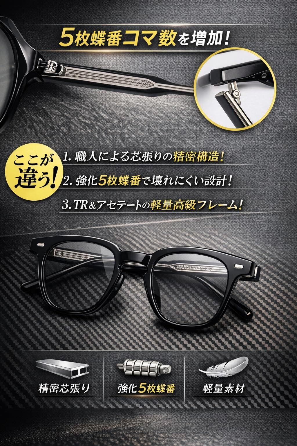 5枚コマ丁番構造: 丁番・蝶番の破損を防ぐ構造で、通常が3枚コマの丁番なのに対して、フロント2枚コマ、テンプル3枚コマの合計5枚丁番とコマ数増加した構造です。
