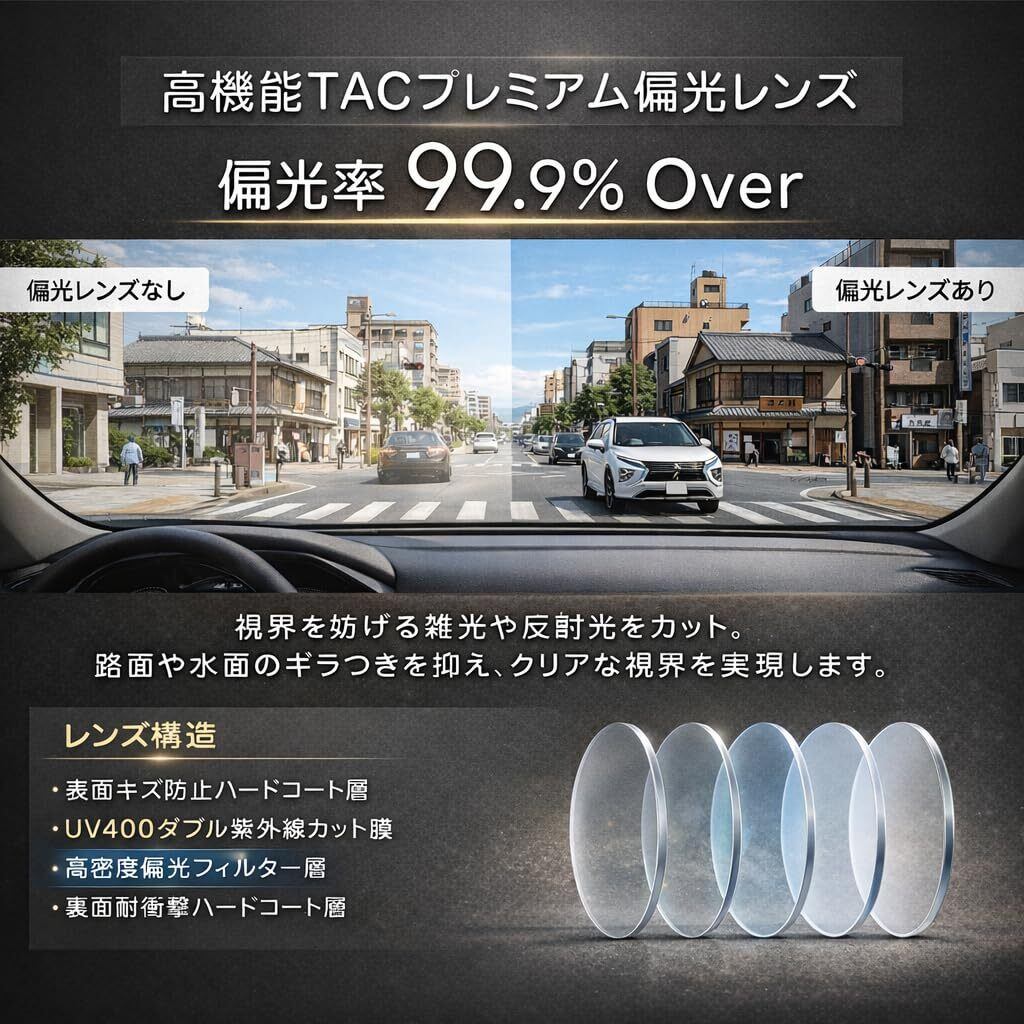 TAC偏光レンズ: UV400保護コーティングは紫外線を99%以上カット。水面、路面、海などの反射光を抑え、眩しさを軽減し、より鮮明で快適な視界を実現。軽量で耐久性があるポリカーボネート素材を使用しています。