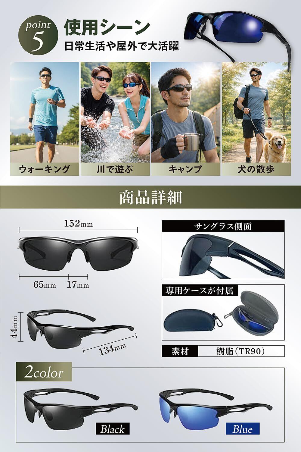 【クリアな視界】 偏光レンズ で反射光カット。照り返しや乱反射を抑え、明瞭な視界をキープする男女兼用のアイウェアです。