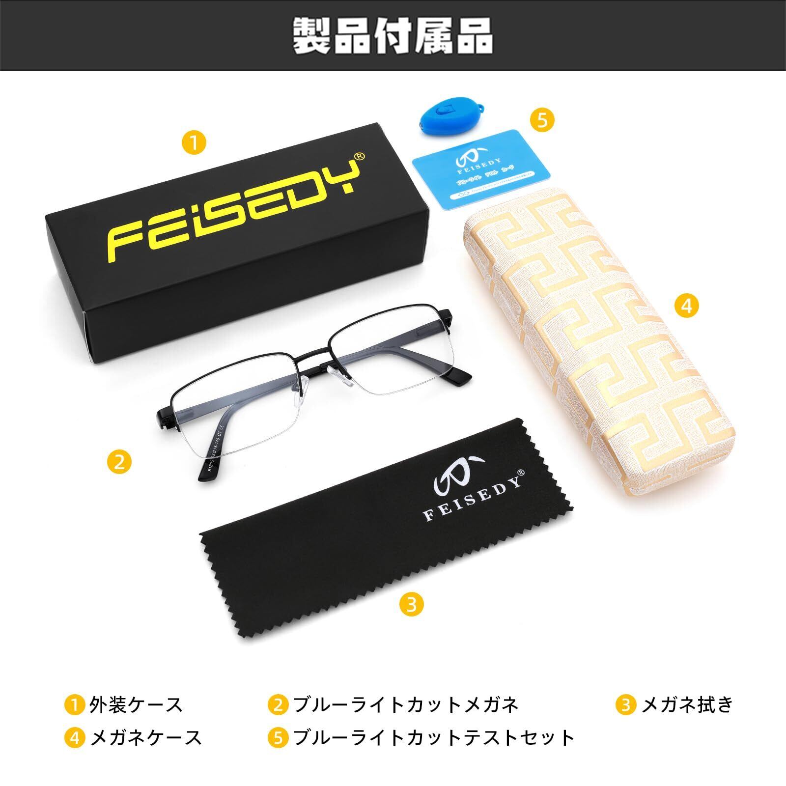付属品:外装ケースx1、メガネケースx1、メガネ本体x1、メガネ拭きx1、ブルーライトカットテストセットx1