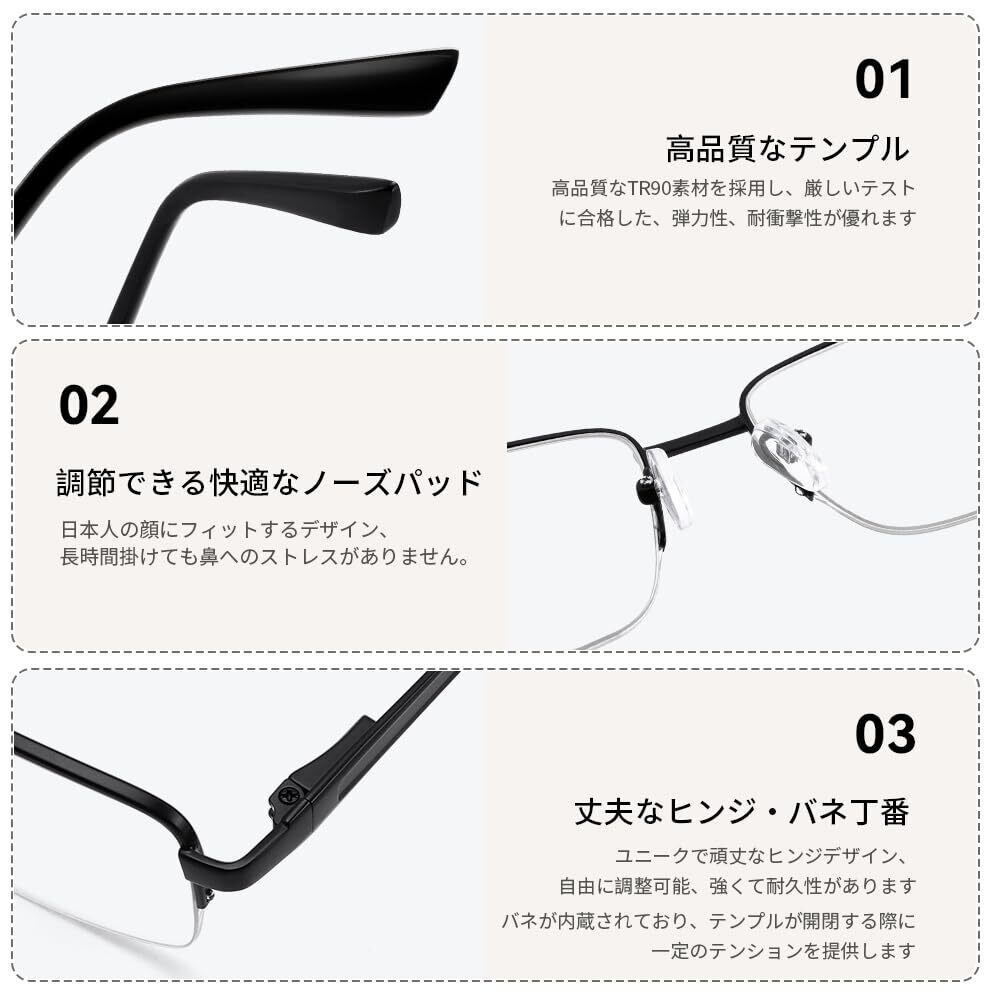 優れた素材:フレームには軽量で耐久性の高い金属素材を使用しており、高級感のある質感とスマートな外観を兼ね備えています。さらに、肌にやさしい調整可能なシリコン製ノーズパッドを採用し、鼻にしっかりフィットしてズレにくく快適です。スプリングヒンジを搭載しており、こめかみへの圧迫を軽減し、柔軟性のある掛け心地を実現。長時間の使用でもストレスを感じにくい設計です