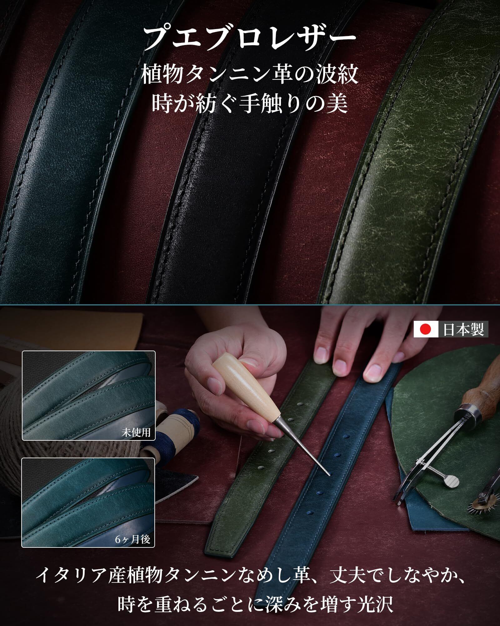 【職人魂のプエブロレザー】一枚一枚に込められた匠の手仕事。日本製ならではの品質で、使い込むほど深みを増す艶と風合い。時を刻むごとに味わい深くなる本革の経年変化をお楽しみください。