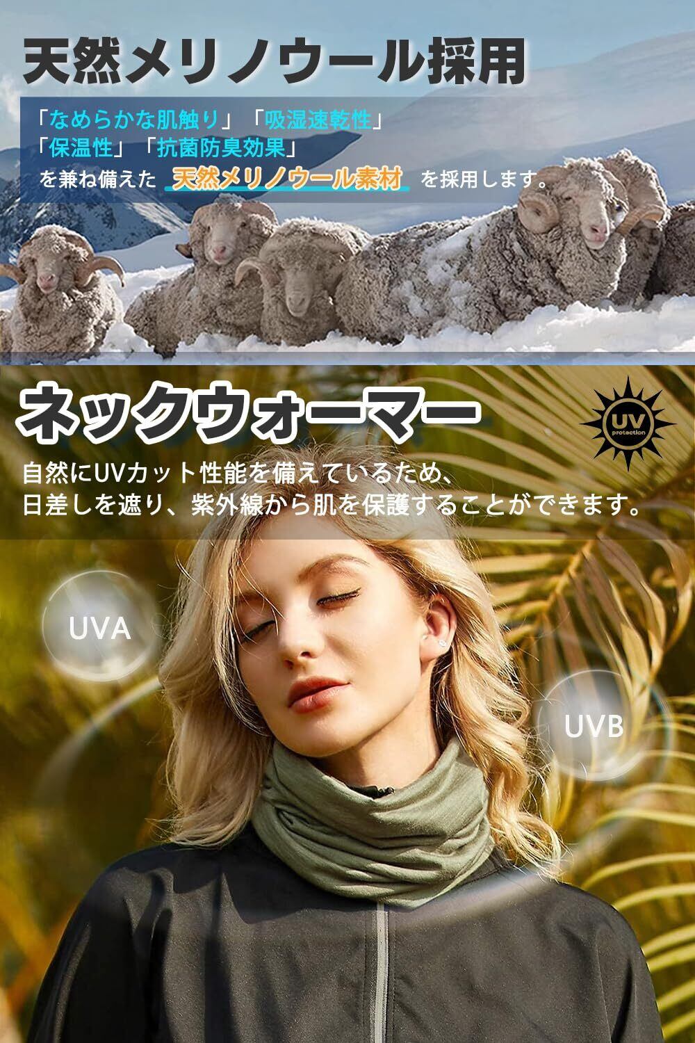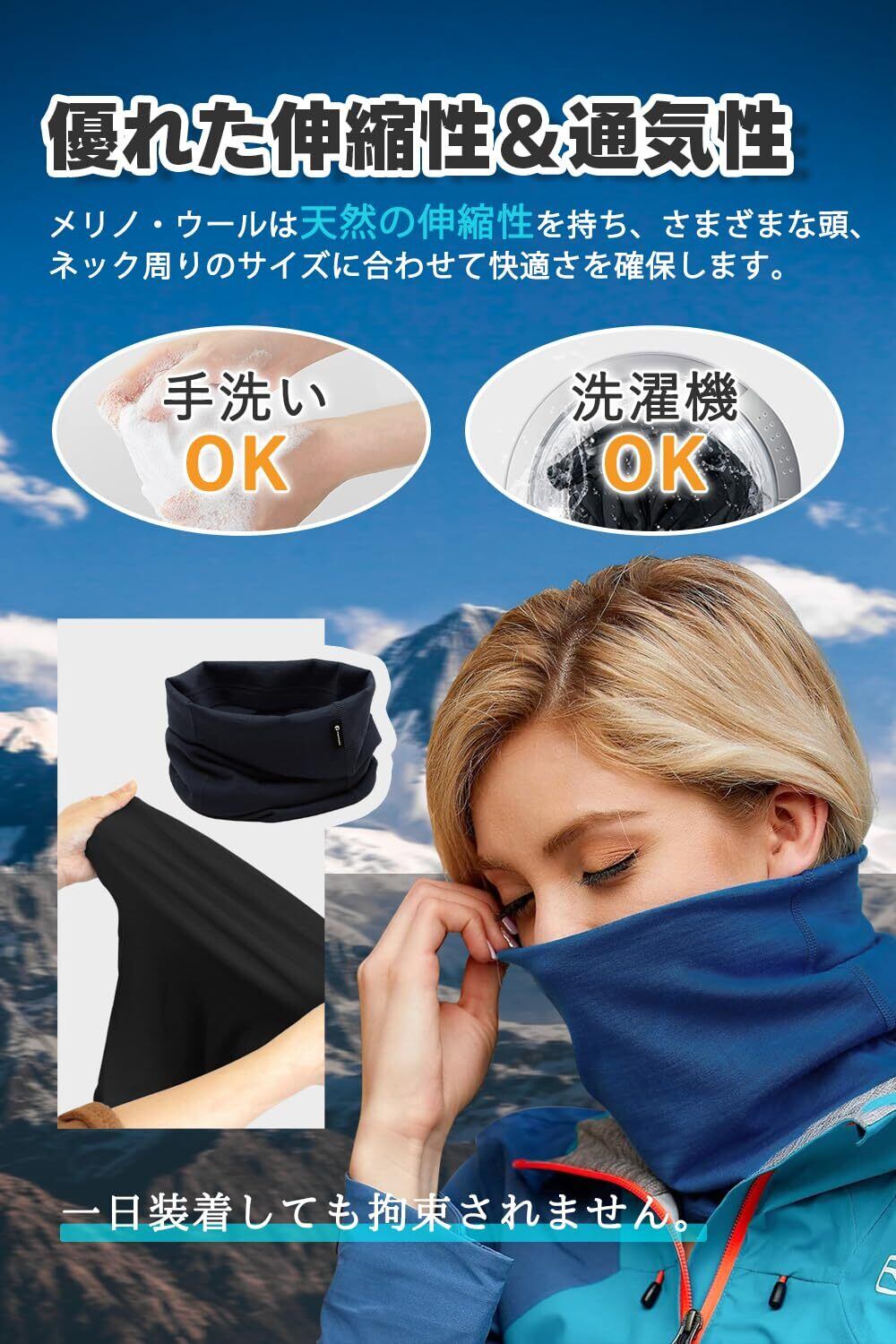 【天然メリノウールの素材】厳選した天然メリノウール混紡生地を仕上げられたネックウォーマーです。非常に細い繊維でできており、空気を含むことができるため、肌触りはなめらかで、優れた保温性を持っています。また、通気性が高いため、汗をかいても蒸れにくいのが特徴です。