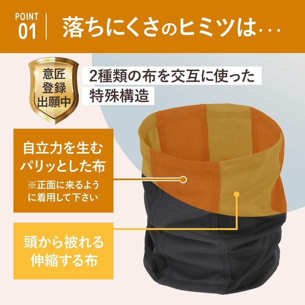 【薄いけど立ち上がりやすい】ハリのある布を使用し、薄手ネックウォーマーの難点だった「落ちやすさ」を解消。首の上までしっかりカバーします。