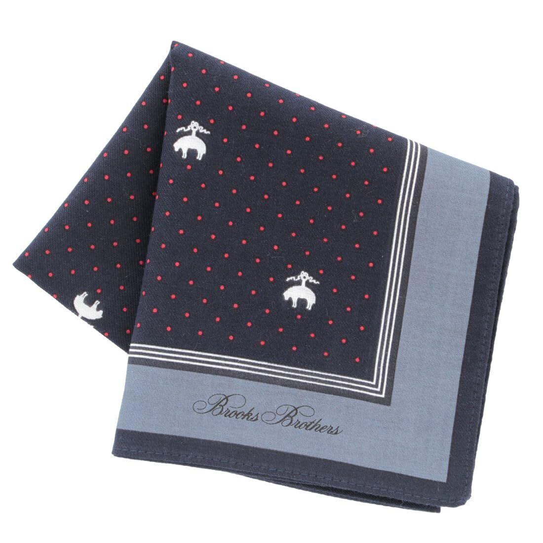 【 ブルックス ブラザーズ】ブルックス ブラザーズのシンボルマークのGF(ひつじ・ゴールデン フリース)にピンドットを組み合わせ、シンプルなデザインの中にもブランドらしさが表現されたプリントハンカチです。 洗って、干す、だけ! easy care のハンカチーフ。