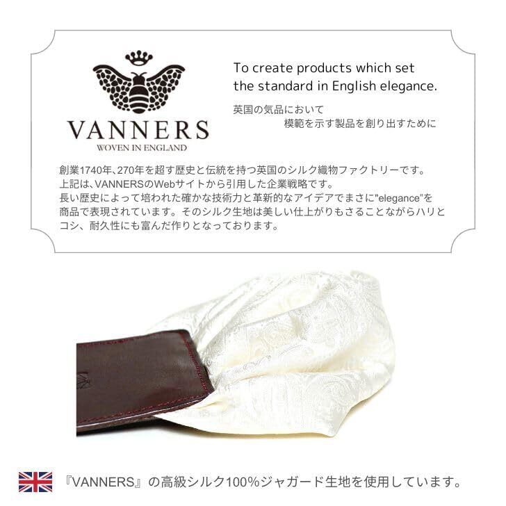 1740年創業の英国名門シルク織物メーカー『VANNERS』のシルク生地を使用した製品です。老舗ならではの高密度で上質なシルク生地は、ハリとコシ、加えて耐久性に富んでいます。この『VANNERS』の生地を日本国内で縫製・加工し、最高品質のプレミアムポケットチーフに仕上げました。上質なシルクは特有の光沢感と程よい厚みがあり、胸元に男らしい色気のあるお洒落を演出します。