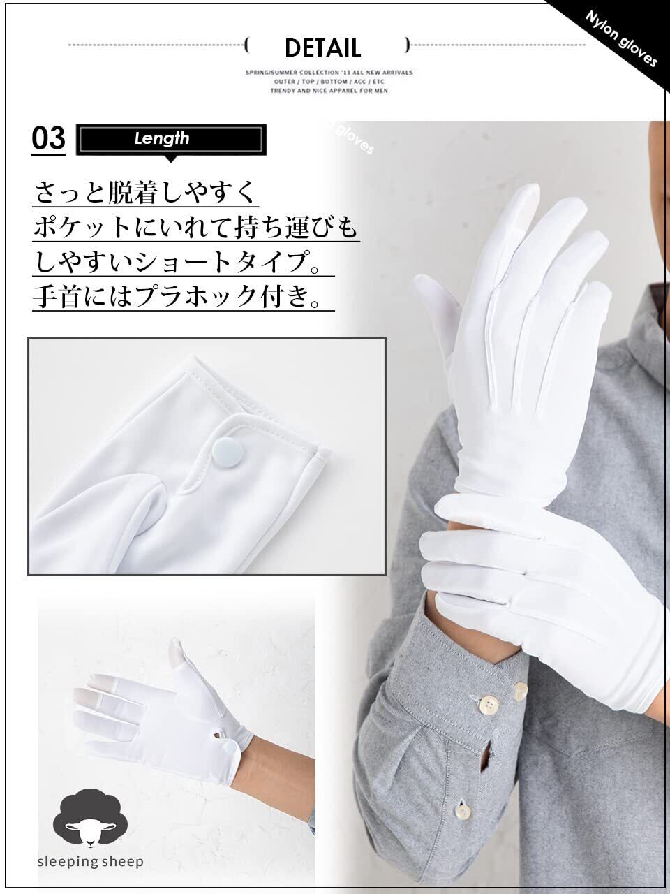 品よく見せてくれるアイテムなので接客業、警備員、警察、鉄道、観光バス、選挙用、冠婚葬祭に好適。コスプレなどにも使えると人気のホワイトグローブです。