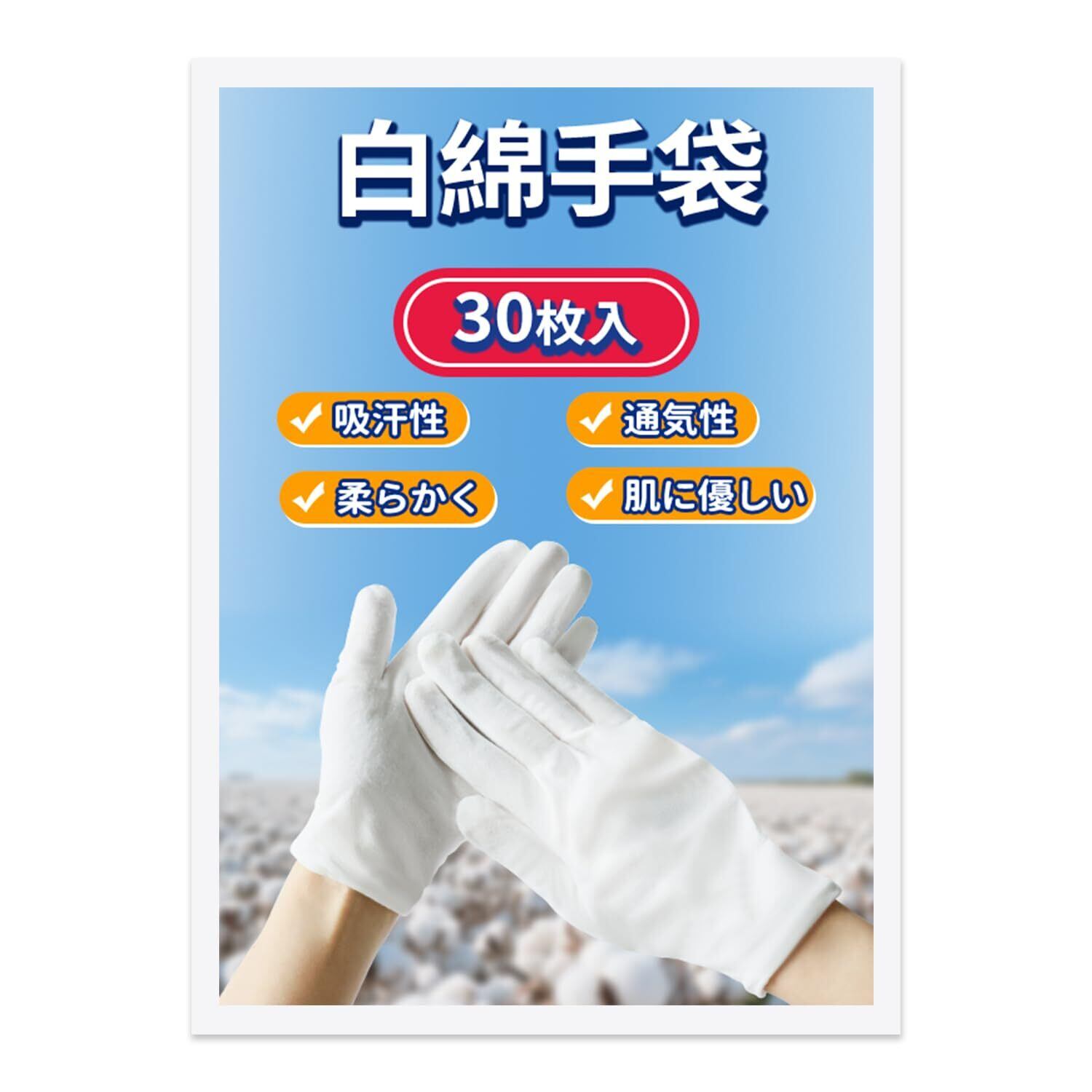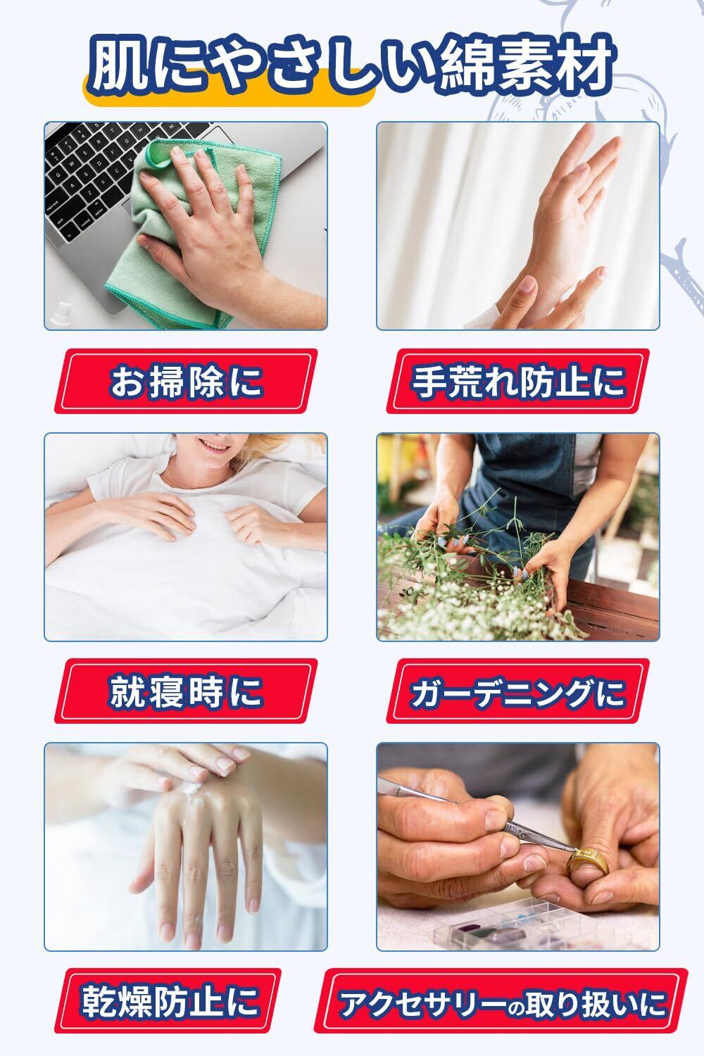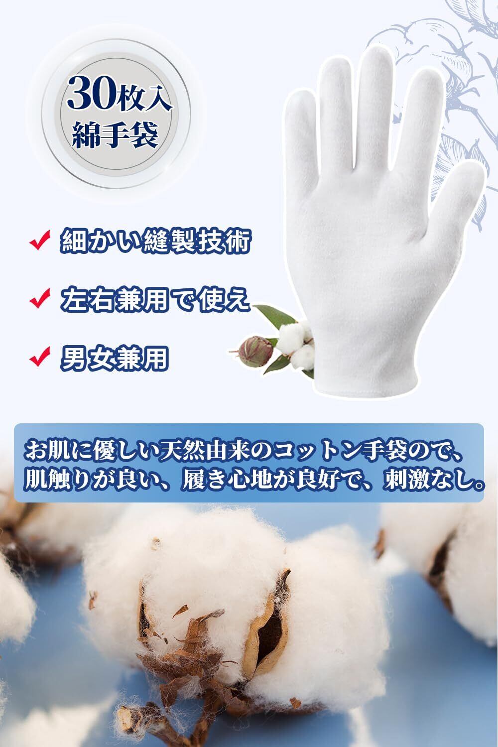 【高質な綿の白い手袋、肌触りも良く】コットン100%で、肌触りが良くて、しっかりフィットします。手のひび割れや乾燥が気になる季節にぴったりです。綿素材であり、ゴム手袋のインナーとしても最適で、手が汗ばむこともなく快適です。