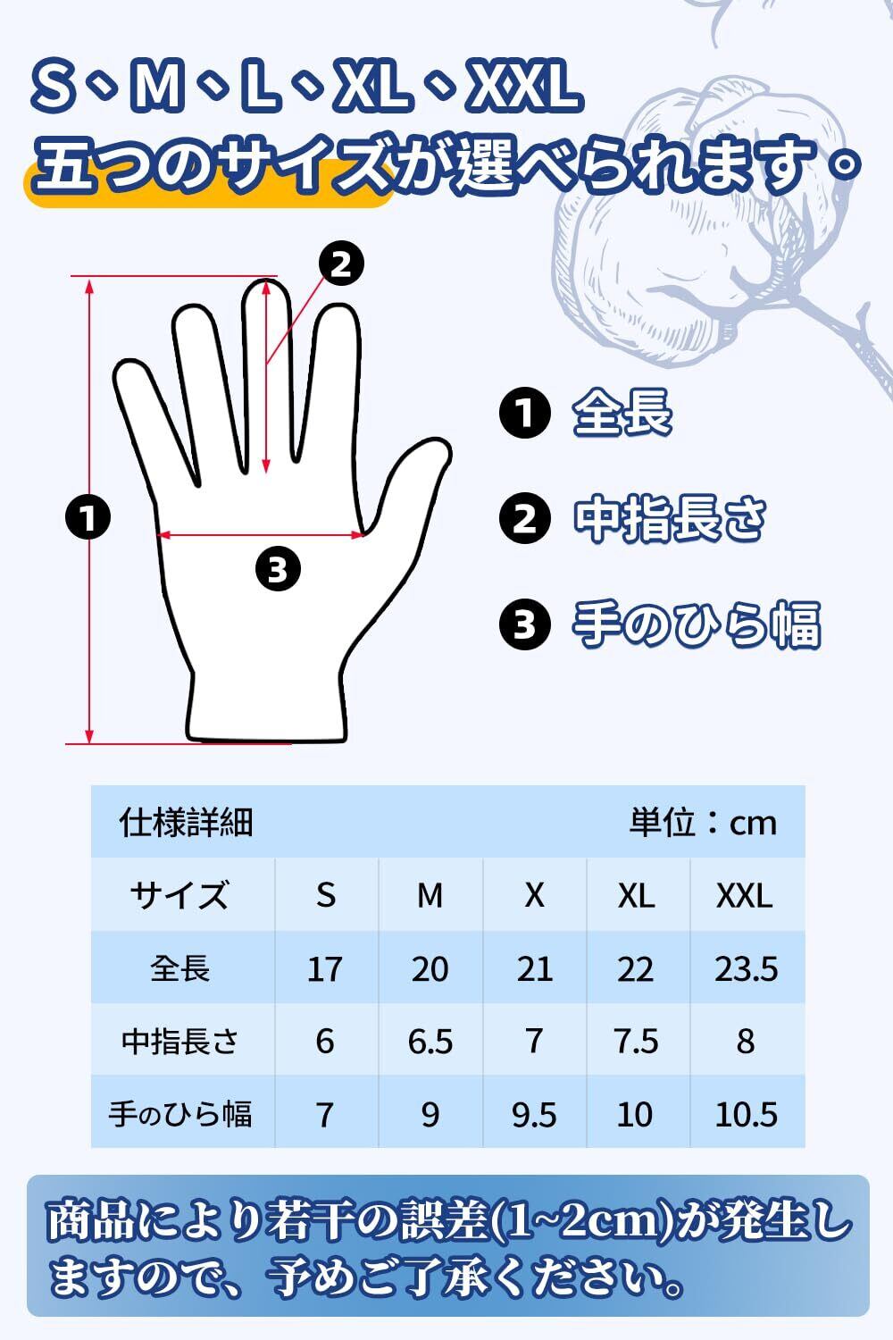 【通気性があり使用が辛くない】この手袋は綿素材で肌に優しく、通気性、吸汗性に優れているので、毎日の使用しても安心です。吸汗性に優れており、肌触りソフトですし、綿なので厚いビニール手袋の下に蒸れ予防に役立っています。
