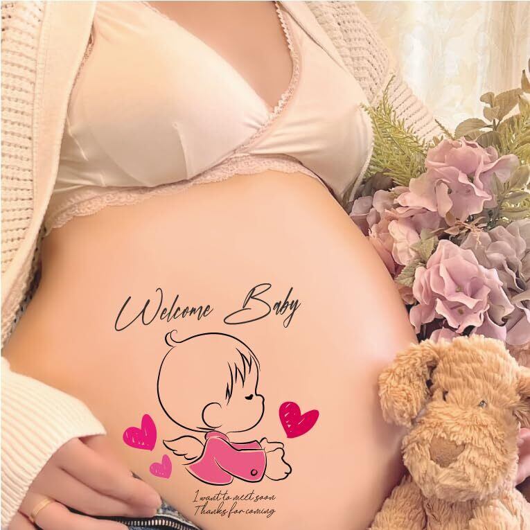 【在庫処分】マタニティフォト シール 女の子 マタニティふぉと シール 人気 赤ちゃん Q2 KISS ベビー ピンク マタニティフォトシール マタニティフォト マタニティペイント ベリーペイント タトゥー かわいい プレゼント 出産祝い マタニティシール 妊婦 セルフ フォト Temporary Pregnancy Tattoos 貼り方説明付き (A4サイズQ2)