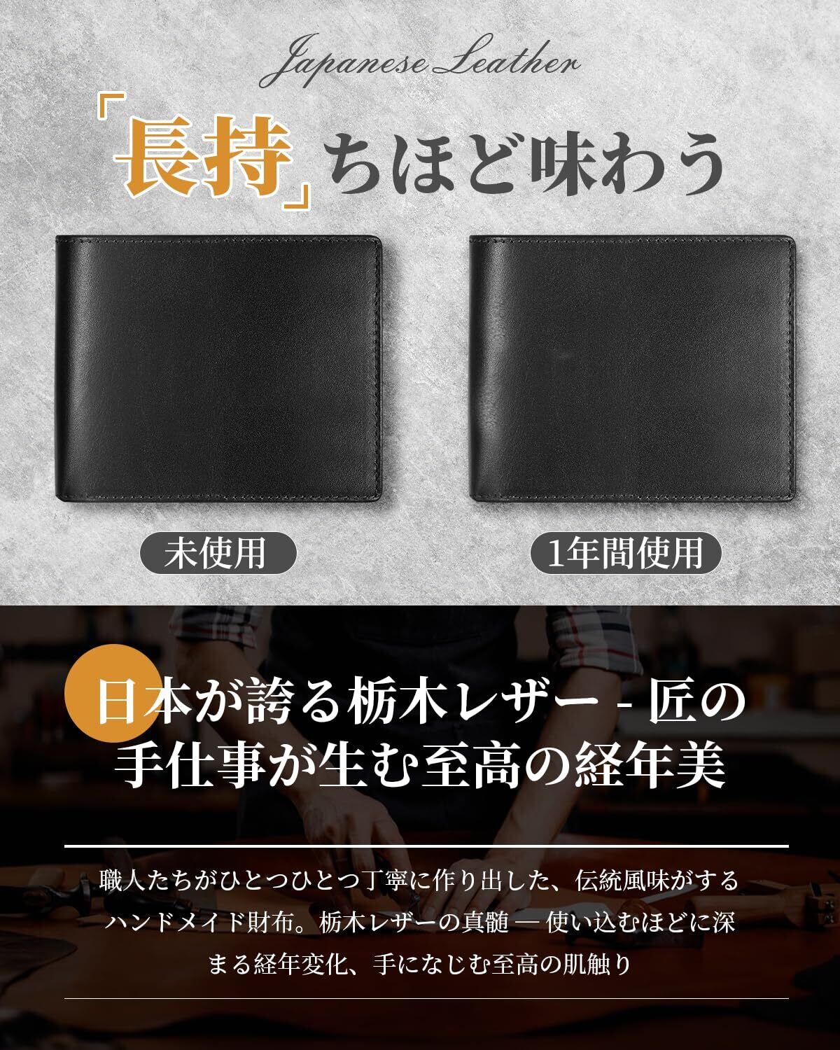 【厳選栃木レザー使用】栃木レザーは、日本の職人による伝統的な製法で作られる最高級レザーです。❶有害薬品を一切使用せず、天然樹脂で3-6ヶ月以上かけて鞣し上げる「エコタンニング製法」を採用❷熟練職人が1点ずつ手作業で磨きをかける「ひと手間工程」を厳守。他社では再現不可能な質感を実現❸シンプルかつ高級感ある風合いが特長。ビジネスからカジュアルまで、男女問わず幅広い層から支持