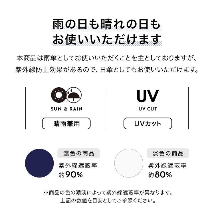 【晴れの日も使える雨傘(晴雨兼用)】 この製品は雨傘としてお使い頂くことを主としていますが、紫外線防止効果があります。 但し、色の濃淡によって紫外線遮蔽率(UVカット率)が異なります。次の数値を目安としてご参照ください。 淡色:約80%、濃色:約90%