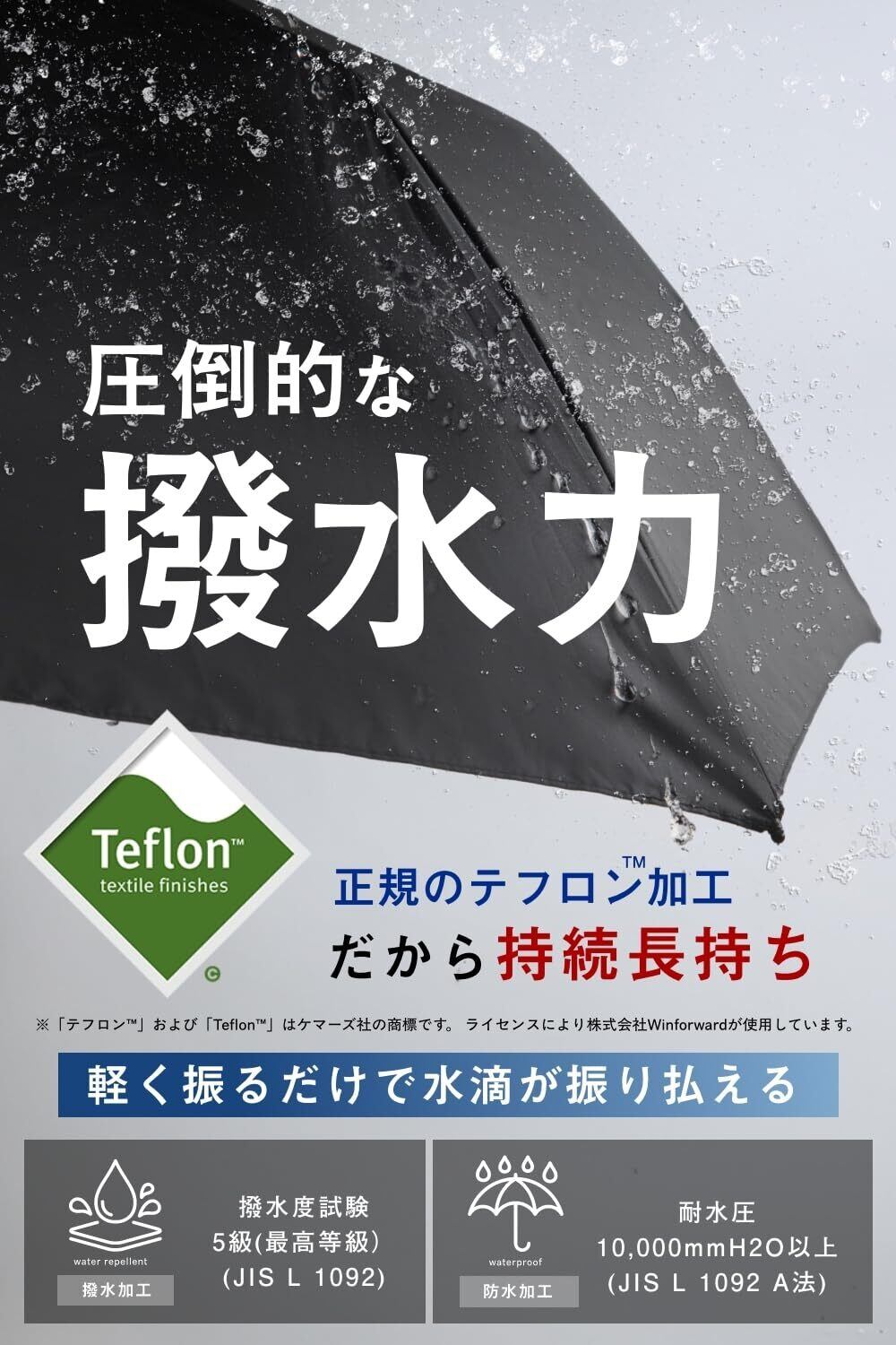 【正規のテフロン加工で強力撥水】 テフロン加工の強力撥水で雨粒を弾き飛ばします。サッとしまえるので電車やバスなどの通勤通学に最適です。 ※「テフロン」および「Teflon」はケマーズ社のです。ライセンスにより株式会社Winforwardが使用しています。
