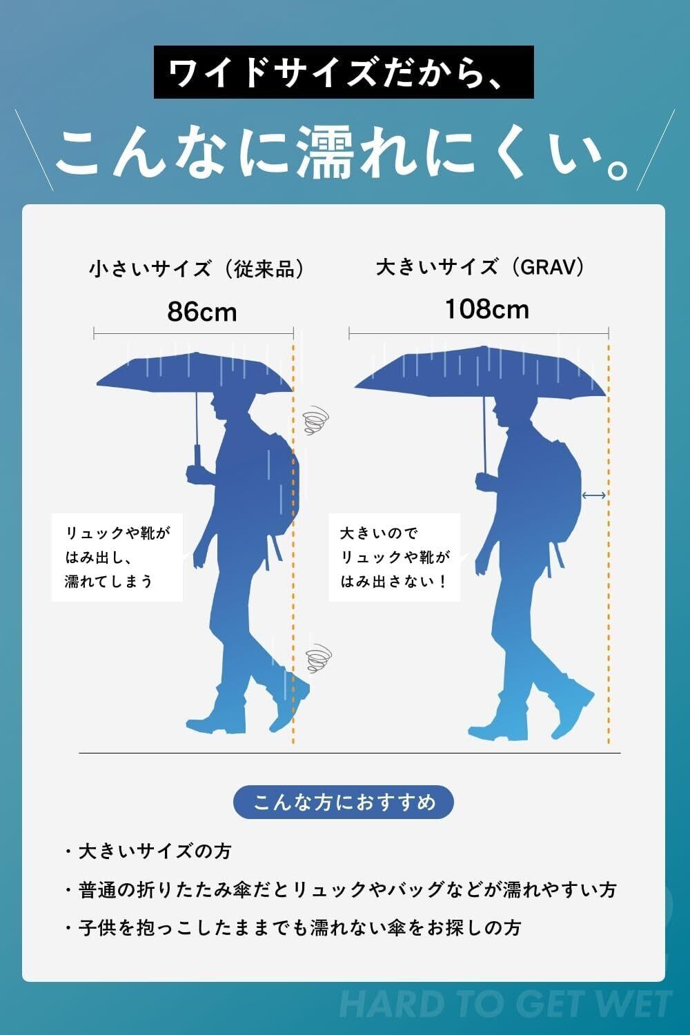 【雨の日は、濡れにくく長時間使用でも疲れにくい (大きめ 直径108cm / 軽量 約181g)】 コンパクトに畳めるのに、広げれば頼もしい大きさ。耐久性と軽さのバランスを極限まで追求し、導き出した正解がこの『 直径:約108cm 』『 超軽量:約181g 』なのです。片手で長時間使用しても疲れにくく、大柄な方でも余裕の大きさで雨や日差しからしっかりカバー。