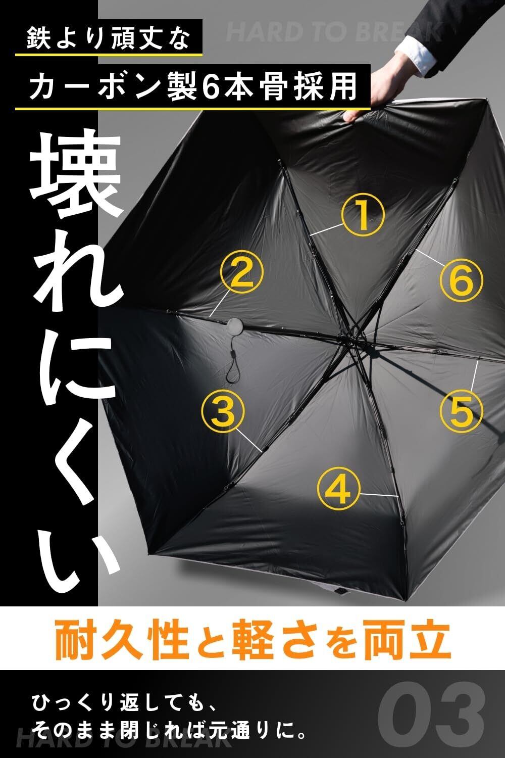 傘を支える6本の親骨は、よりも強い強度を持つハイグレード カーボン素材を採用。 強風で裏返ってもそのまま閉じれば元通り。軽さと強度を兼ね備えたタフな傘です。