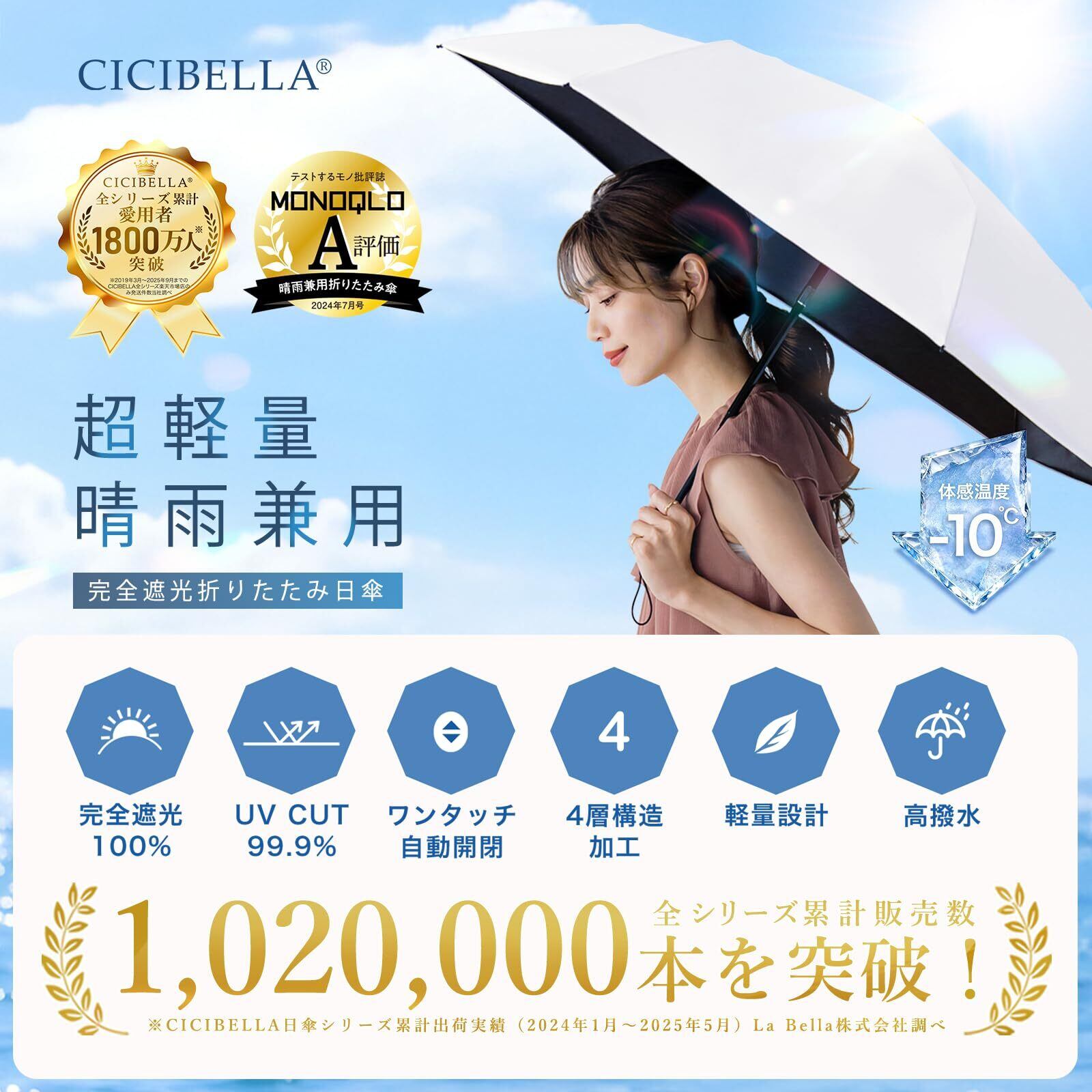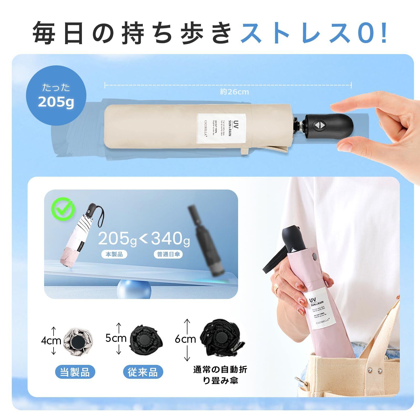 【毎日持ち歩きたくなる超軽量205g設計】約205gの極軽量設計だから、バッグに入れても負担になりにくく、毎日の通勤・通学・お出かけ・旅行にも持ち歩きやすい 折りたたみ 日傘 です。一般的な 自動開閉 の 折りたたみ傘 は重さや厚みが気になりやすいですが、本 おりたたみ傘 は軽量性と携帯性を重視し、コンパクトに収納しやすいサイズ感に仕上げました。 日傘 は「使いたい時に持っていない」と意味が薄れるからこそ、CICIBELLAは 完全遮光 ・ UVカット ・ 晴雨兼用 といった機能だけでなく、毎日無理なく携帯できる軽さにもこだわりました。 軽量 折りたたみ傘 、携帯便利な 日傘 、おしゃれで実用的なレディース・メンズ兼用モデルを探している方におすすめ 日傘 uvカット 100 遮光 折り畳み です。