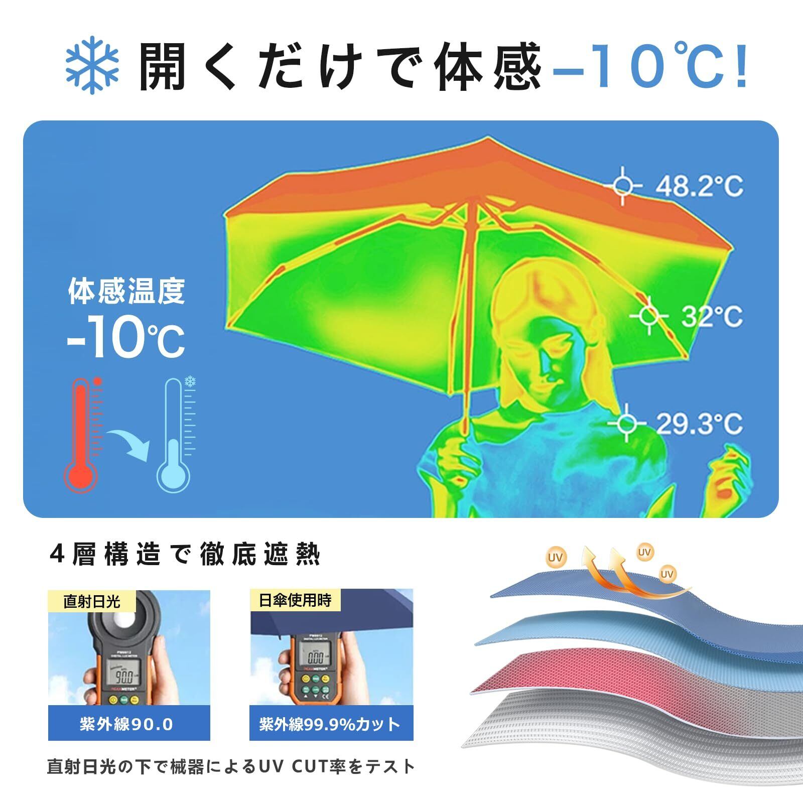 【完全遮光100%・UVカット99.9%でしっかり紫外線対策】JIS認証済の完全遮光100%生地を採用した 折り畳み傘 、UVカット99.9%で紫外線をしっかり遮断。強い日差しを防ぎたい夏の外出、通勤、通学、買い物、アウトドアでも使いやすい 晴雨兼用 日傘 です。見た目だけのおしゃれな 日傘 ではなく、遮光・遮熱・紫外線遮断という本来必要な性能をきちんと備えているため、日焼け防止や暑さ対策、熱中症対策を重視する方にも適しています。特に「軽いだけの日傘では不安」「uvカットだけでなく遮熱性も欲しい」という方に向けて、毎日使う実用品としての性能を高めた一本 折り畳み傘 です。