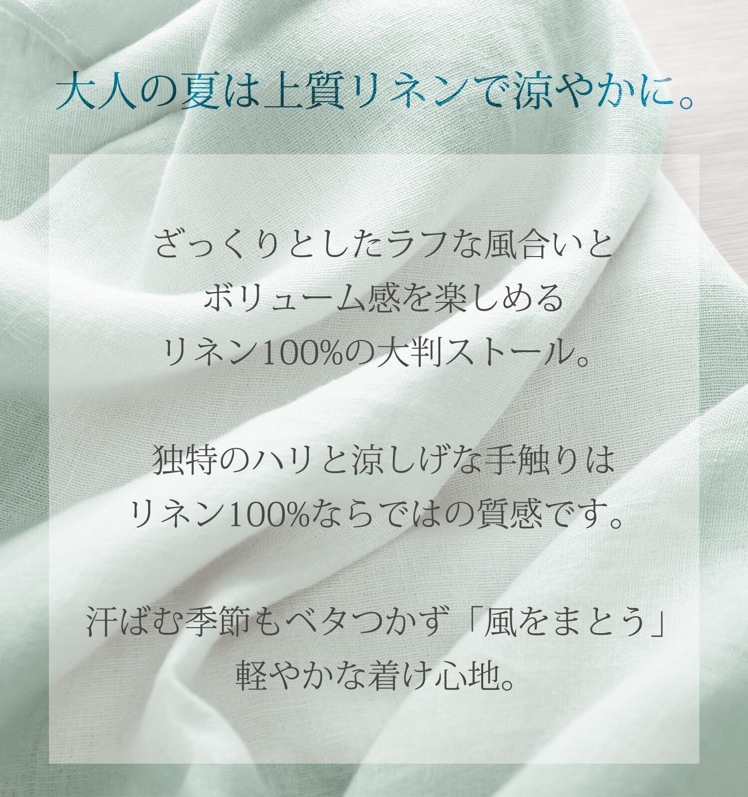 非常に通気性が高く、汗をかいてもべた付くことなくサラッと使用できるリネンを100%使用した大判ストール。