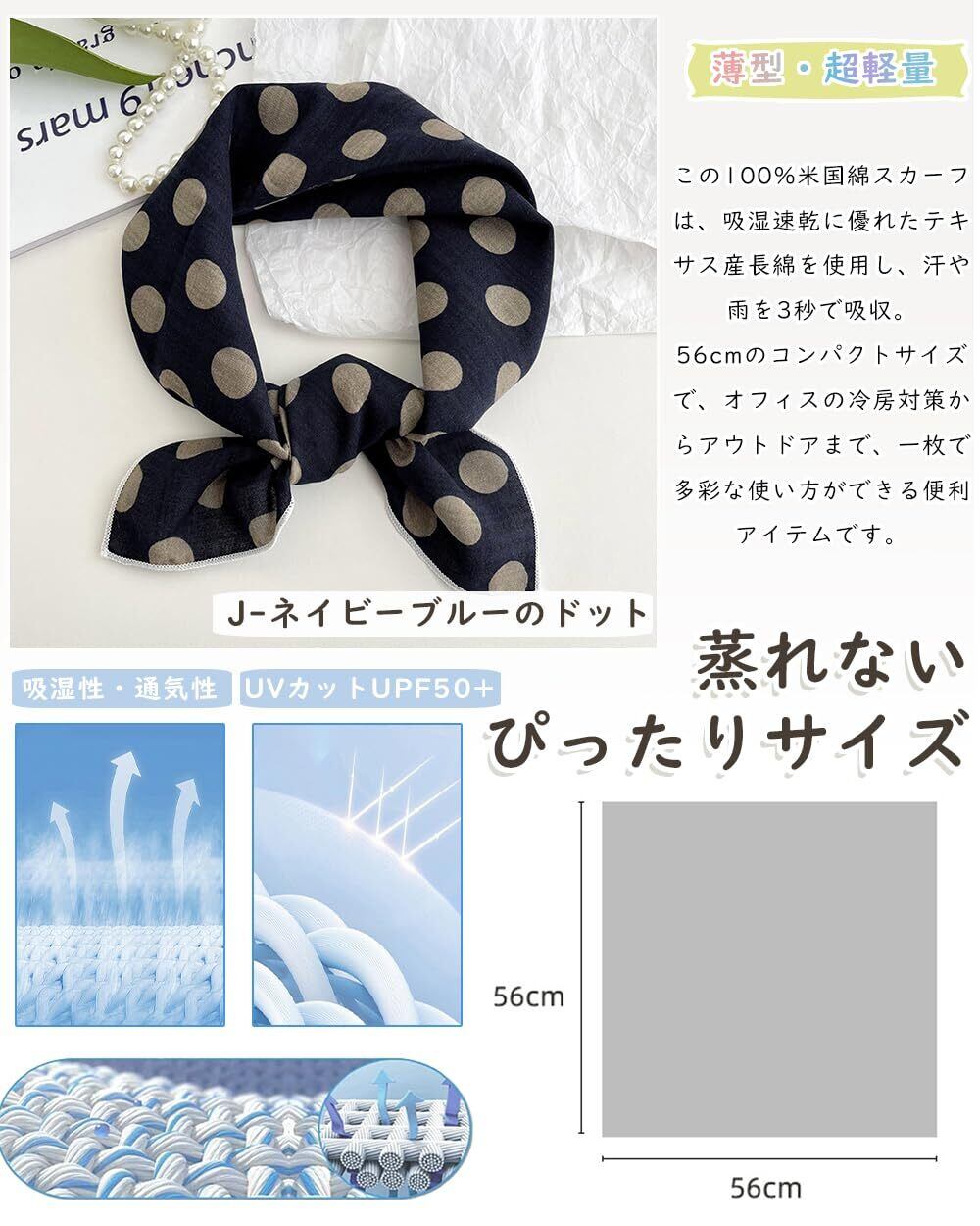 【 綿100% スカーフ 】綿100% のやさしい肌触り吸湿性・通気性抜群の綿素材で、蒸し暑い日もサラリと快適。56cm四方のコンパクトサイズだからバッグに常備OK!