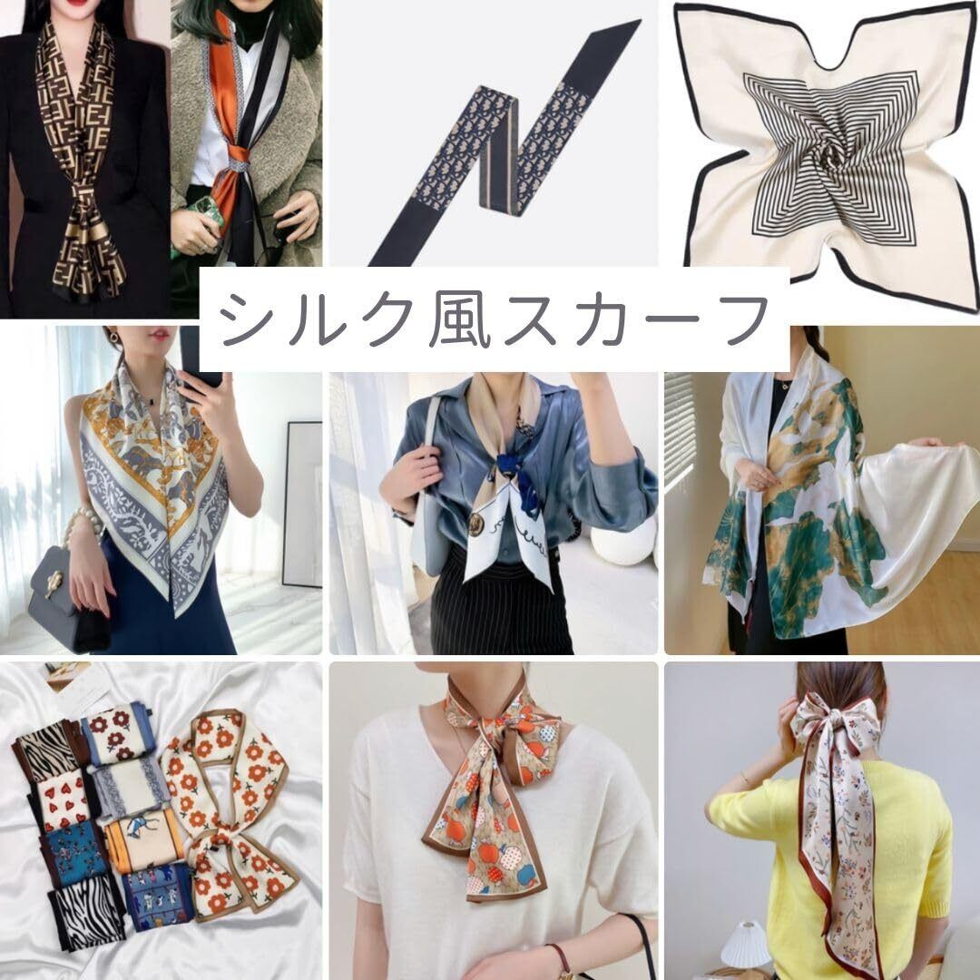 オールシーズン使用できる正方形のスカーフです。お顔周りのアイテムは相手に与える印象がとても良くなるので、合わせるだけで派手過ぎず華やかで上品な女性らしい印象に変わります。SNSではシュシュのように髪をまとめたり、ヘッドスカーフとしての使い方もたくさん投稿されていて人気です。