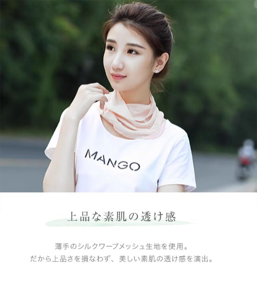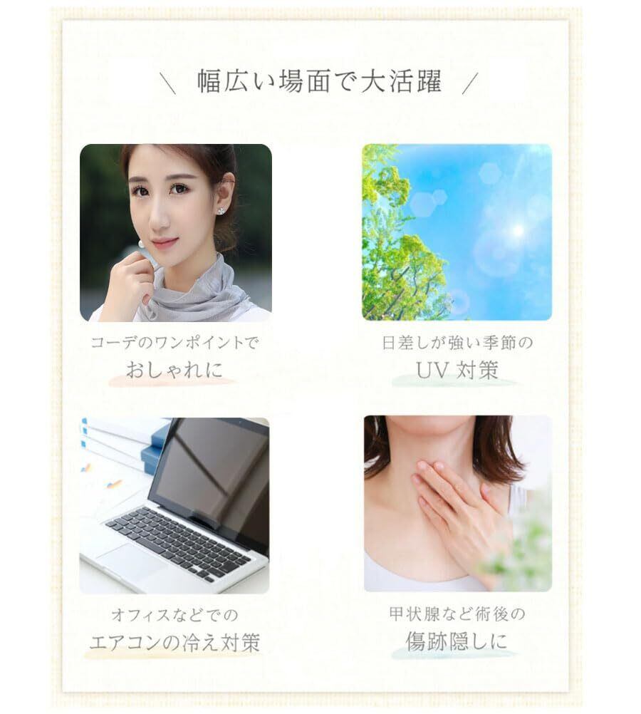 さらりと軽い着用感ですので、汗ばむ季節の日焼け対策や冷房で冷えてしまいがちな首周りのケアにおすすめ。
