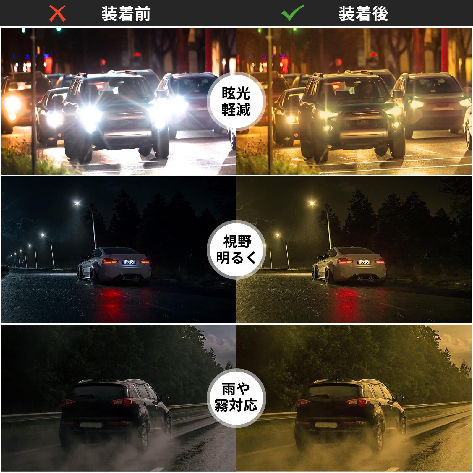 【JIS夜間運転規格適合で女性も安心】日本のJIS規格に適合した夜間専用イエロー偏光レンズを採用。女性の夜間ドライブや一人での外出時に、ヘッドライトの眩しさを効果的に軽減し、安全で快適な視界を提供します。科学的設計による信頼の規格品です。