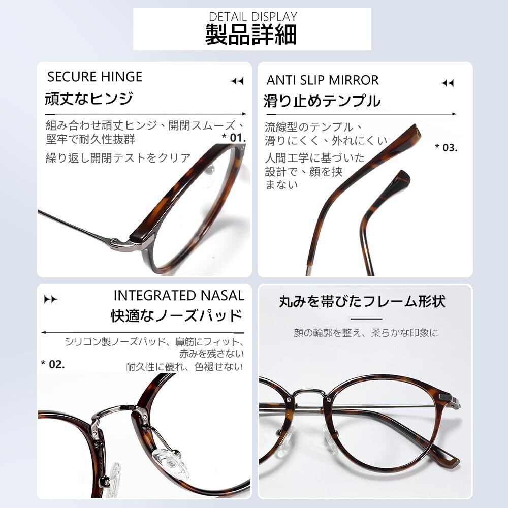 おしゃれボストンデザイン:丸みを帯びたボストン型フレームで、ファッション性を重視。男女問わずコーディネートに合わせやすく、カジュアルからビジネスまで幅広く活躍