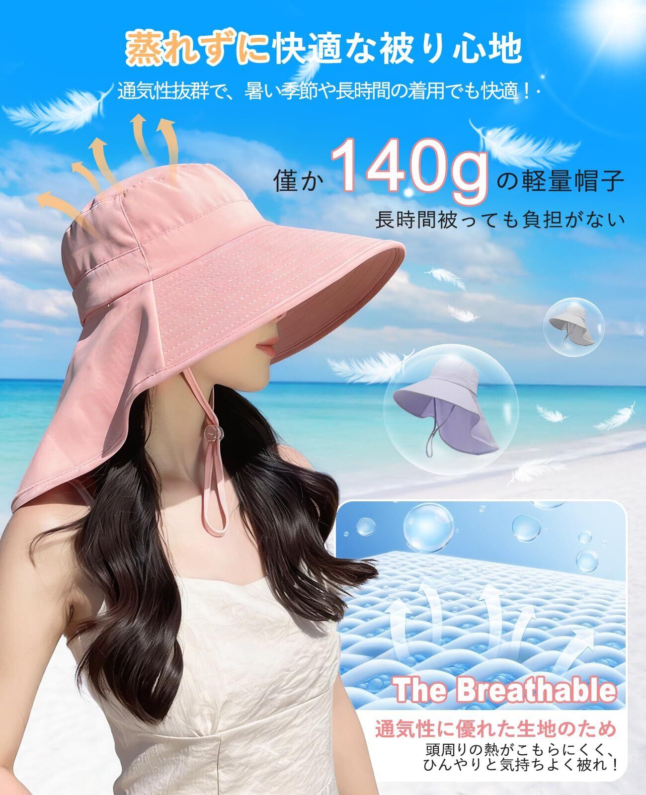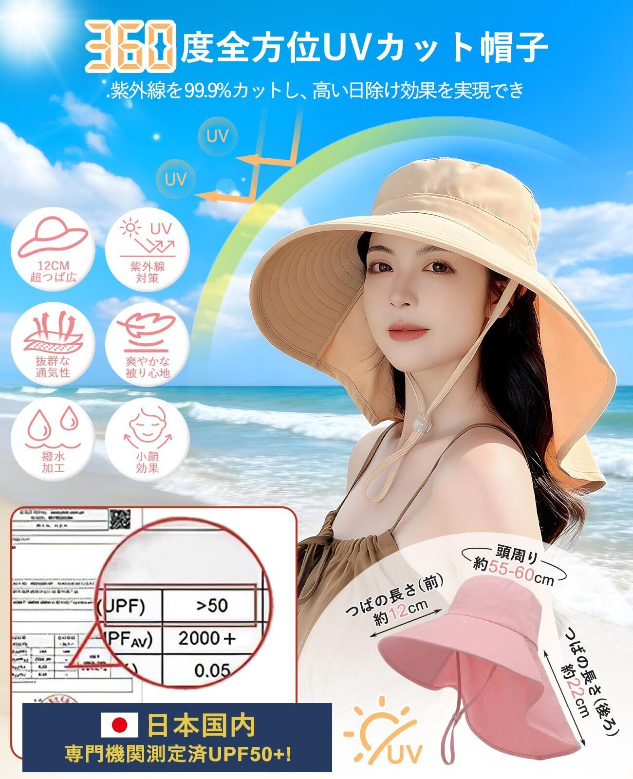 12cm 超つば広&360 度完全 UV カットで首までしっかりガード日焼け止め帽子 12cm の前つばに後ろつばは約 22cm とロング設計で、360 度全方位から顔・首元を守ります。UPF50+・紫外線遮断率 99.9% を実現し、強い日差しから頭皮とお肌を守り、熱中症対策にも効果的です。