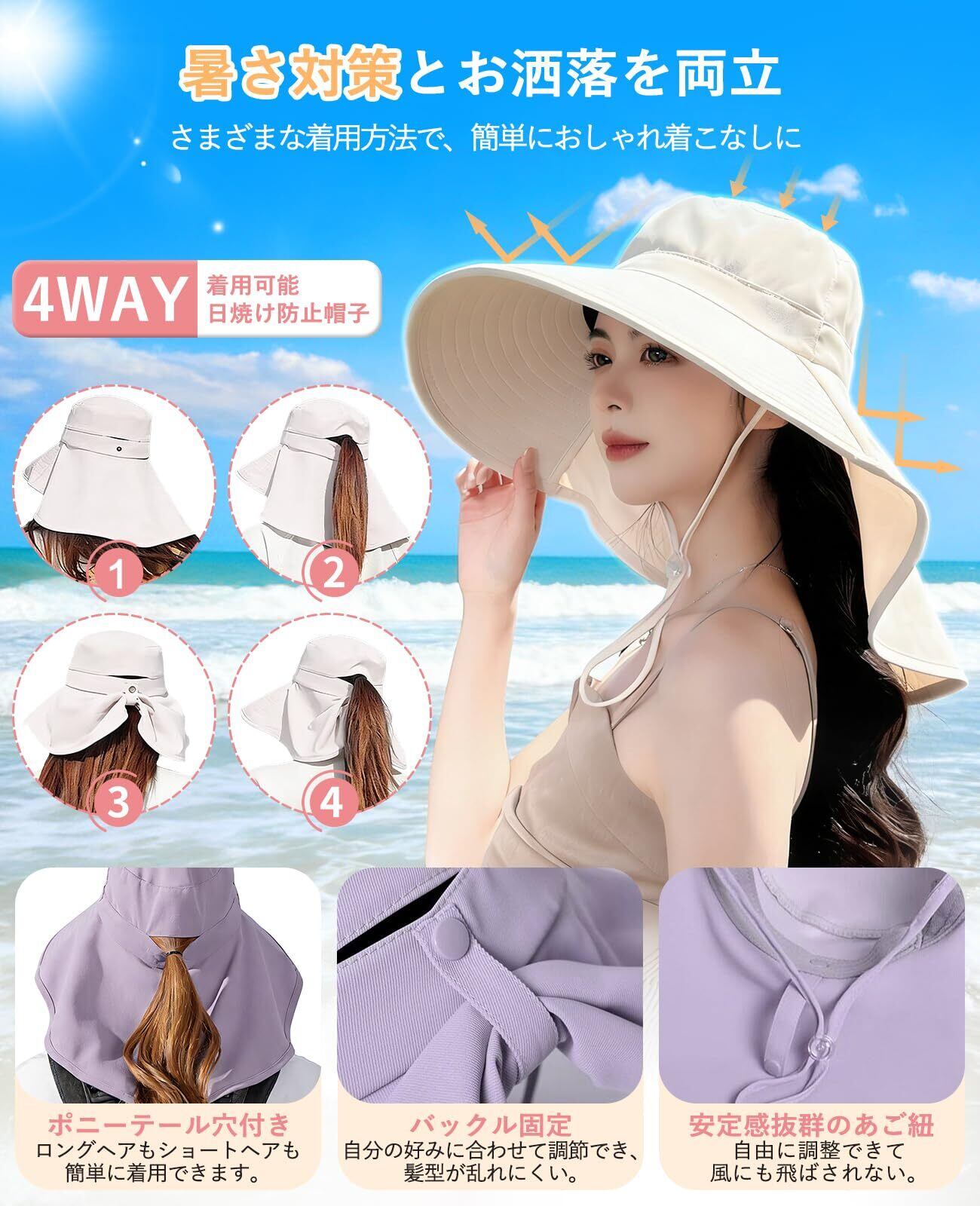 UVカット 帽子 レディース 日焼け対策 12cm 超つば広 360 度全方位遮光 日除け帽子 首筋保護 UPF50+ 接触冷感 通気 撥水加工 ポニーテール穴 あご紐付き 小顔効果 登山 自転車 農作業 海 プール 夏用