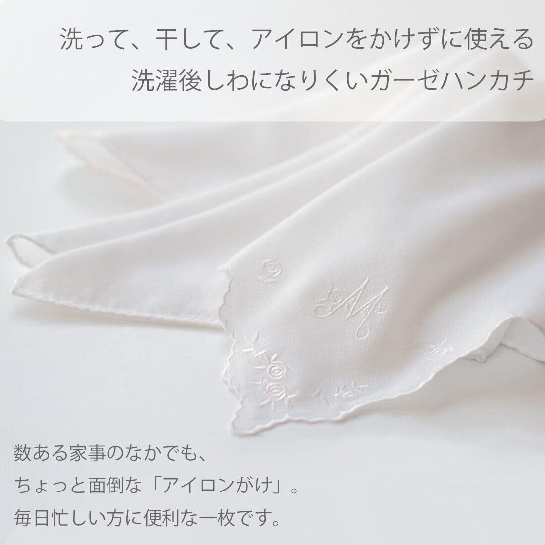 イニシャル刺繍入りで、大切な方へのギフトとしてもぴったりです。白を基調としているので冠婚葬祭、四季を問わずお使いいただけます。