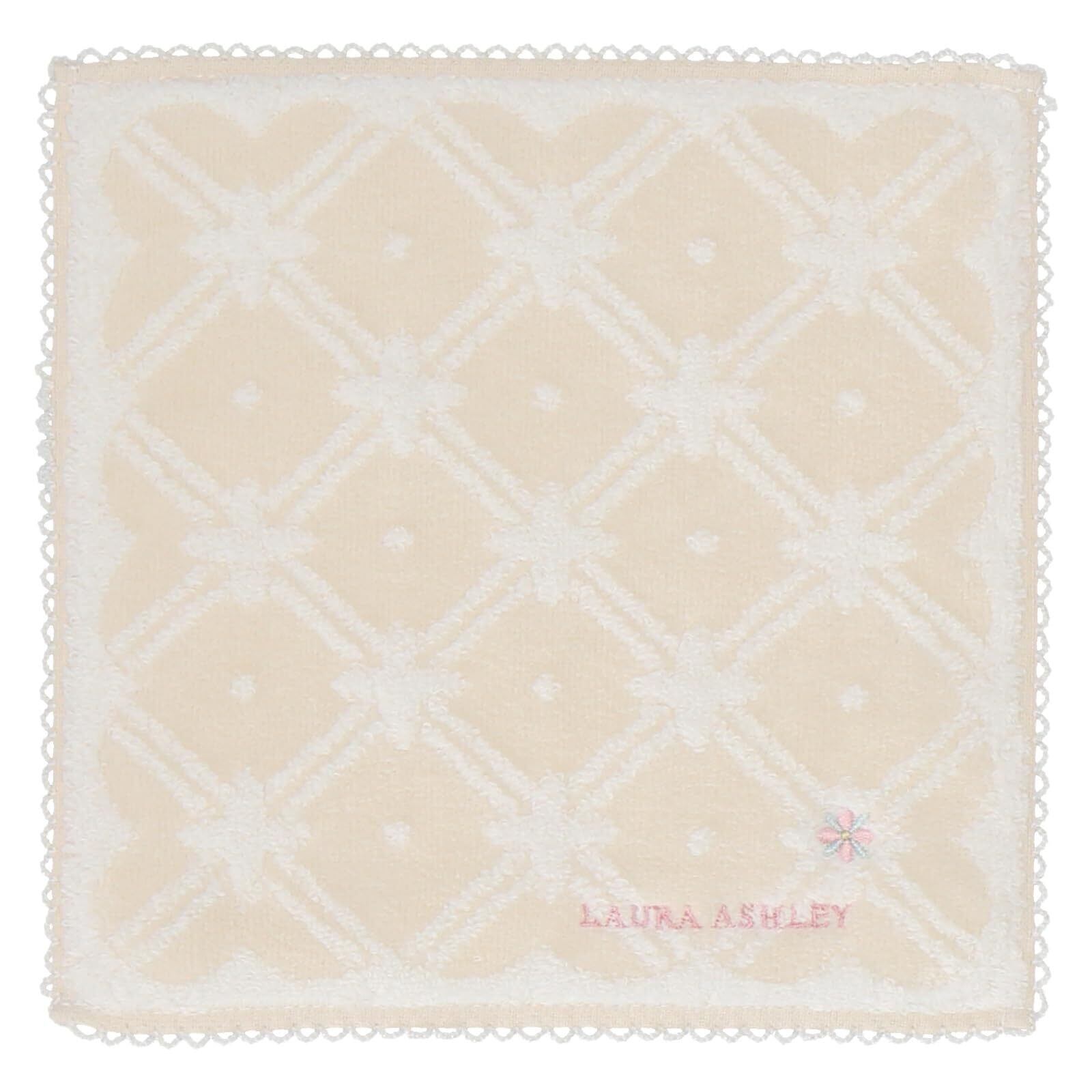 【Laura Ashley(ローラ アシュレイ)のレディース タオルハンカチ】上品な幾何花風のデザインにピコットレースが付いたタオルハンカチです。小さなバッグやポケットにもしまいやすい20㎝のミニサイズ。
