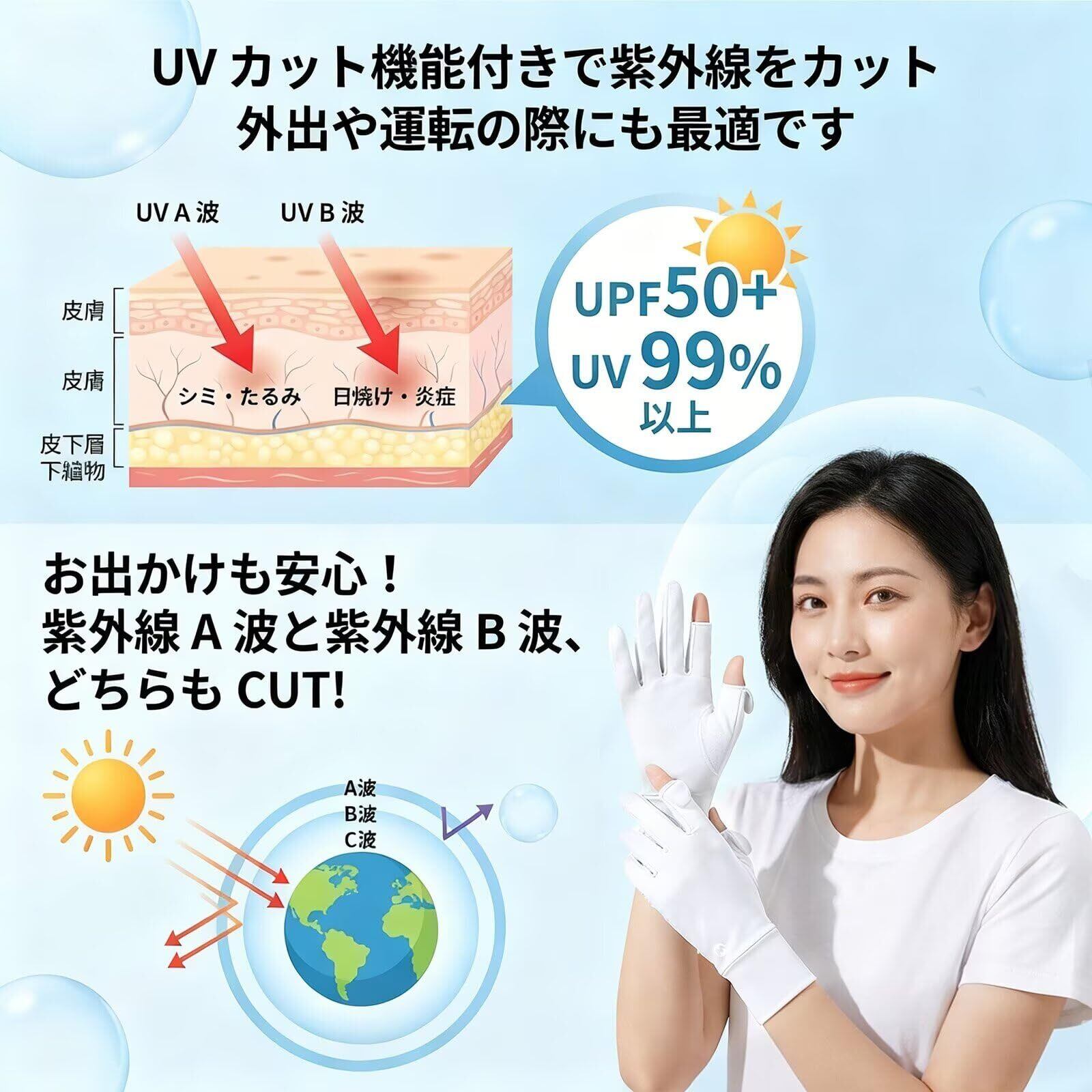 皮膚科医監修 手袋UVカット グローブ レディース 接触冷感 UPF50+ 5本指 レディース ショート 滑り止め 右手2本指出し 日焼け防止 春夏 自転車