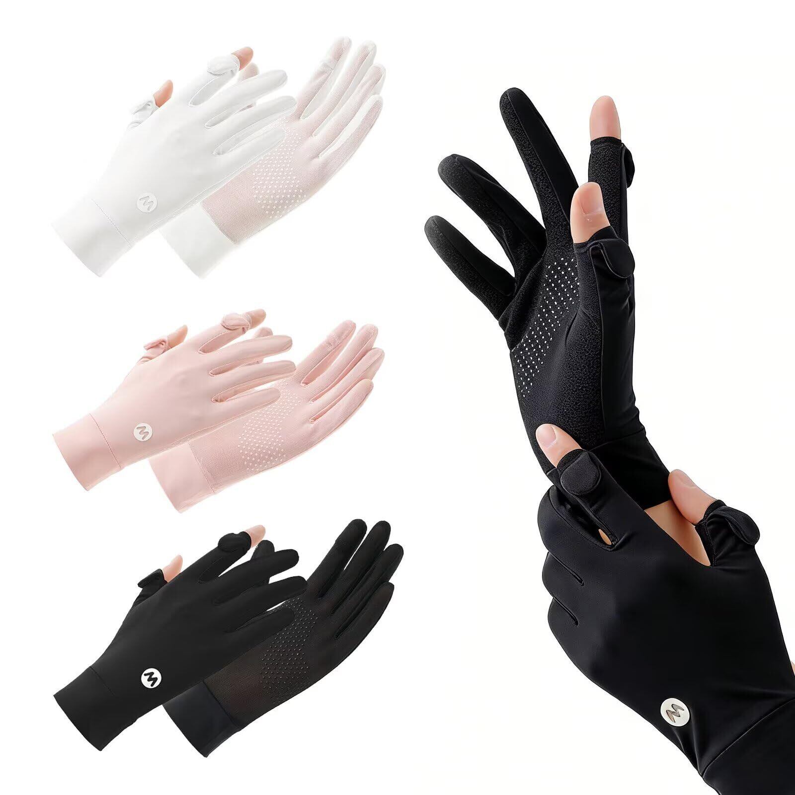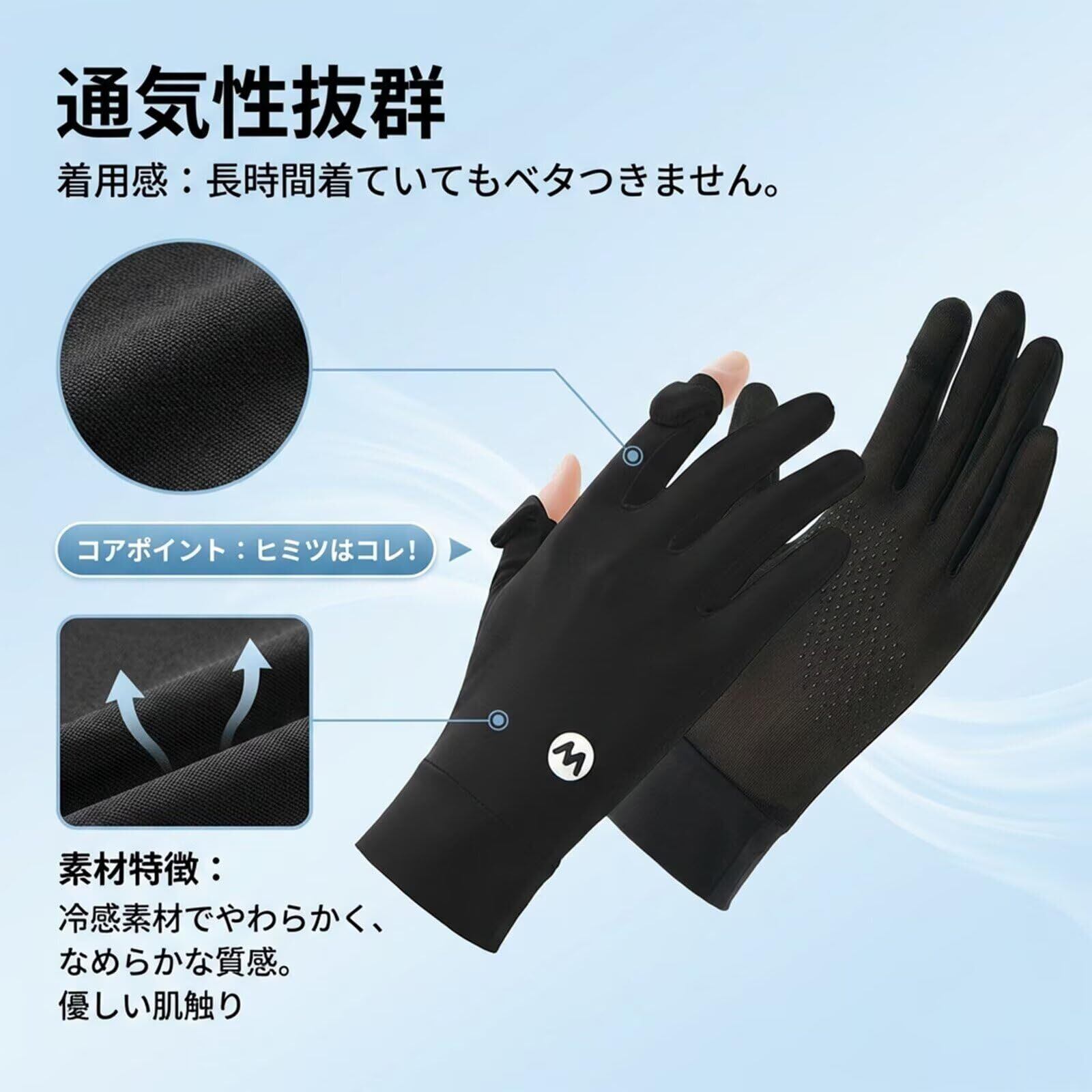 [ジメジメ季節のひんわり手肌]お手入れいらずの冷却素材で、暑い日も手元をひんやり快適に。汗や水に触れると自然な冷感が持続するUVカット手袋です。吸湿速乾性に優れ、夏のジメジメした季節でもさらりとした手肌を保ちます。