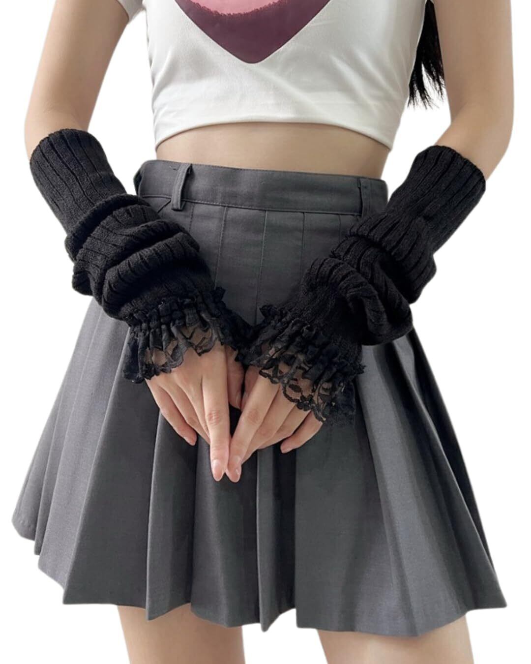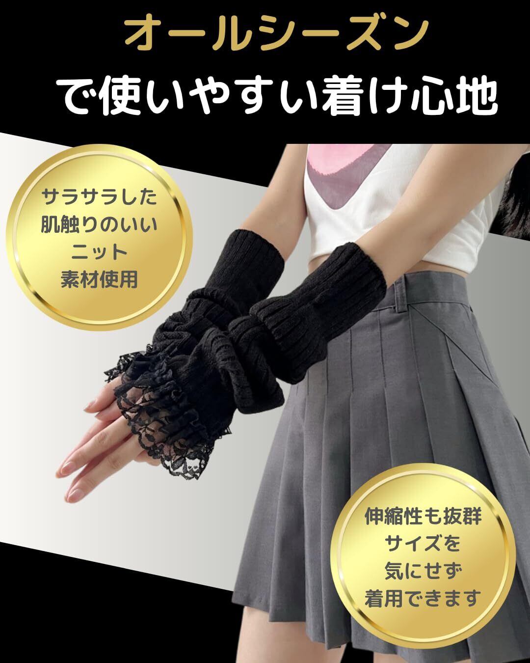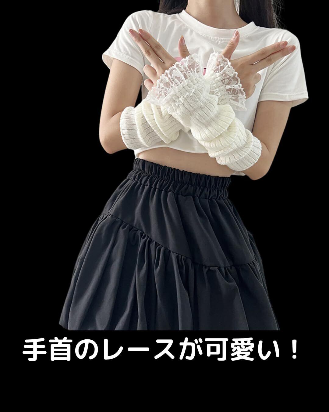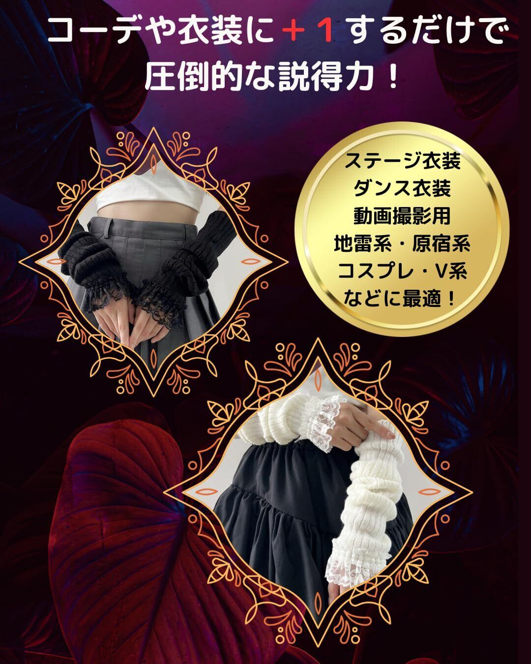 ① デザインポイント フリルとレースを組み合わせた、手元を華やかに演出するアームカバー。シンプルなコーディネートにプラスするだけで、ガーリー・クラシカル・地雷系・量産型など幅広いスタイルにマッチします。袖口のレースが指先まで女性らしい印象を与え、写真映えもしやすいデザインです。