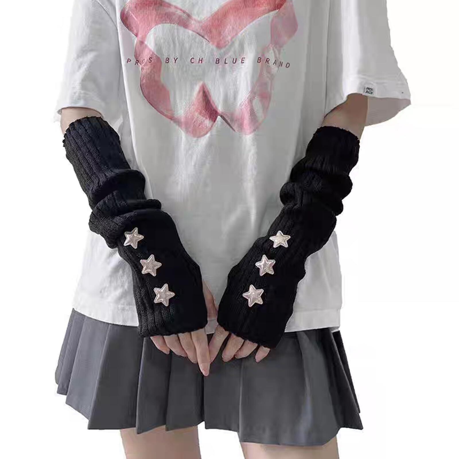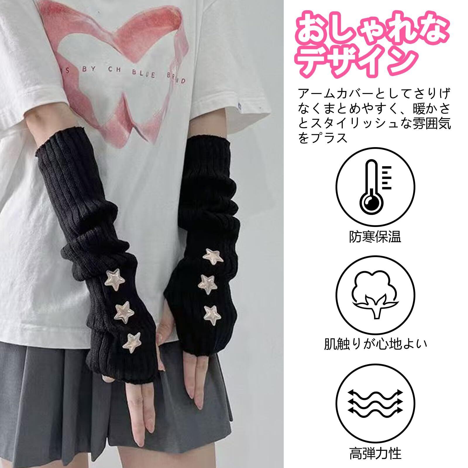 【特価商品】アームウォーマー アームカバー 手袋 ニットアームカバー レディース 親指穴付 スター‘ 地雷系 原宿系 y2k ギャル系 サブカル系 オールシーズン ゴシック 無地 ロング丈 ロリータ 防寒 指穴あり ニットアームスリーブ