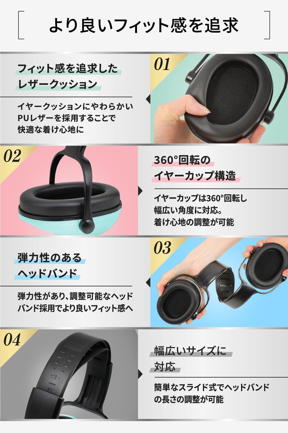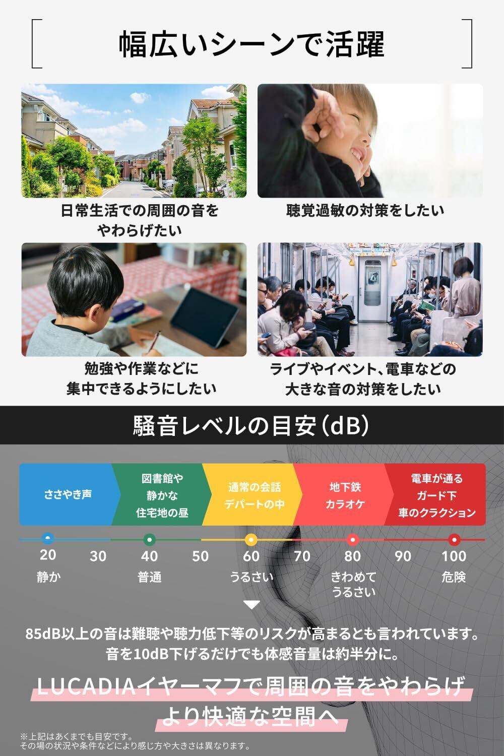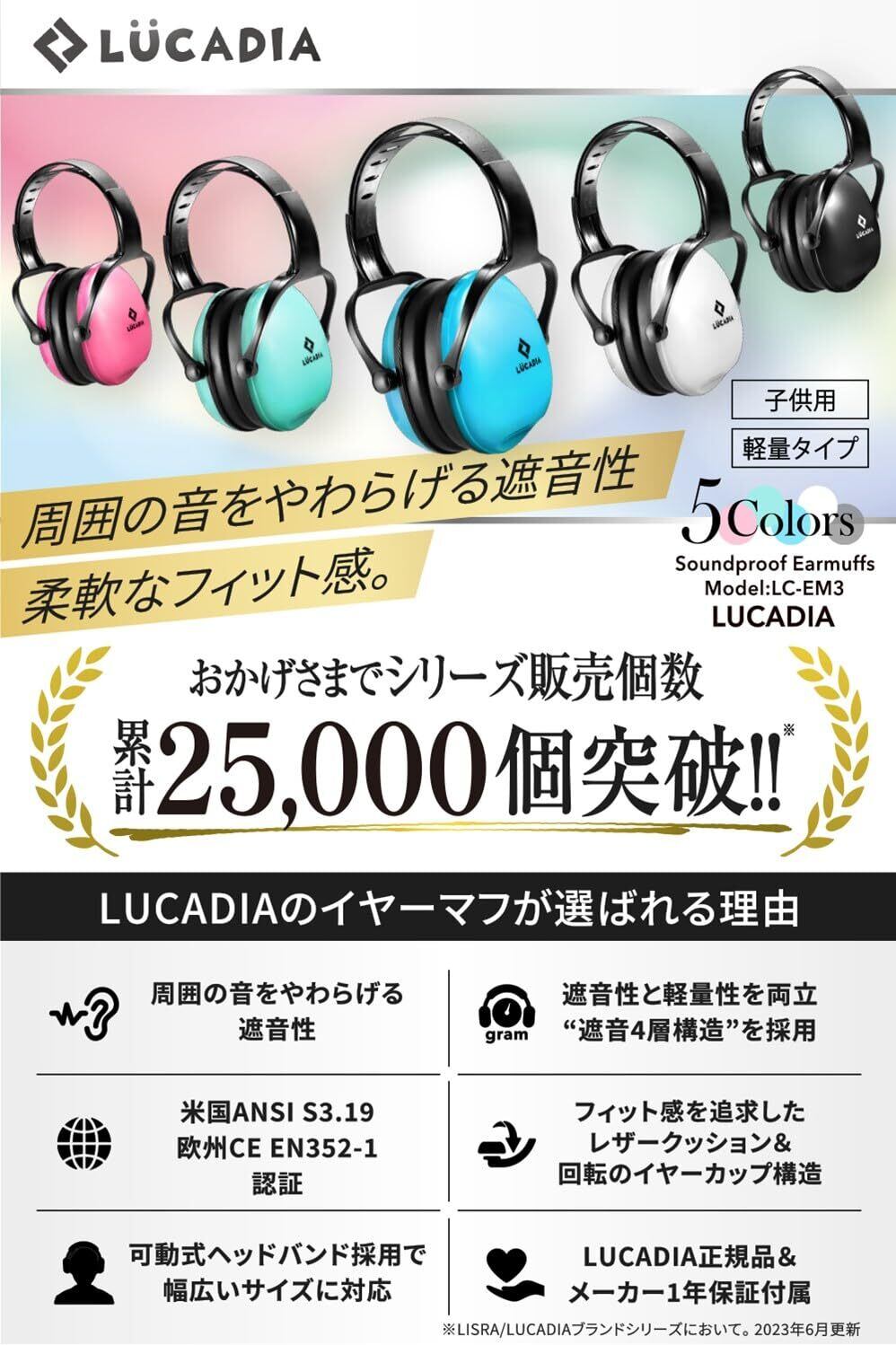 【 周囲の音をやわらげる遮音性×柔軟なフィット感 】コストパフォーマンスを追求したイヤーマフ『 LUCADIA(ルカディア) 』に子供用・軽量タイプのモデルが登場。「周囲の音をやわらげる遮音性」を持ちながらも、快適に装着できるように「柔軟なフィット感」も追求。また、機能性だけでなく、ファッション性も追求したスタイリッシュなデザイナーズ設計となっています。新色も追加し、「ブラック」「ホワイト」「グリーン」「ブルー」「ピンク」の5色より、お好みの色をお選びいただけます。