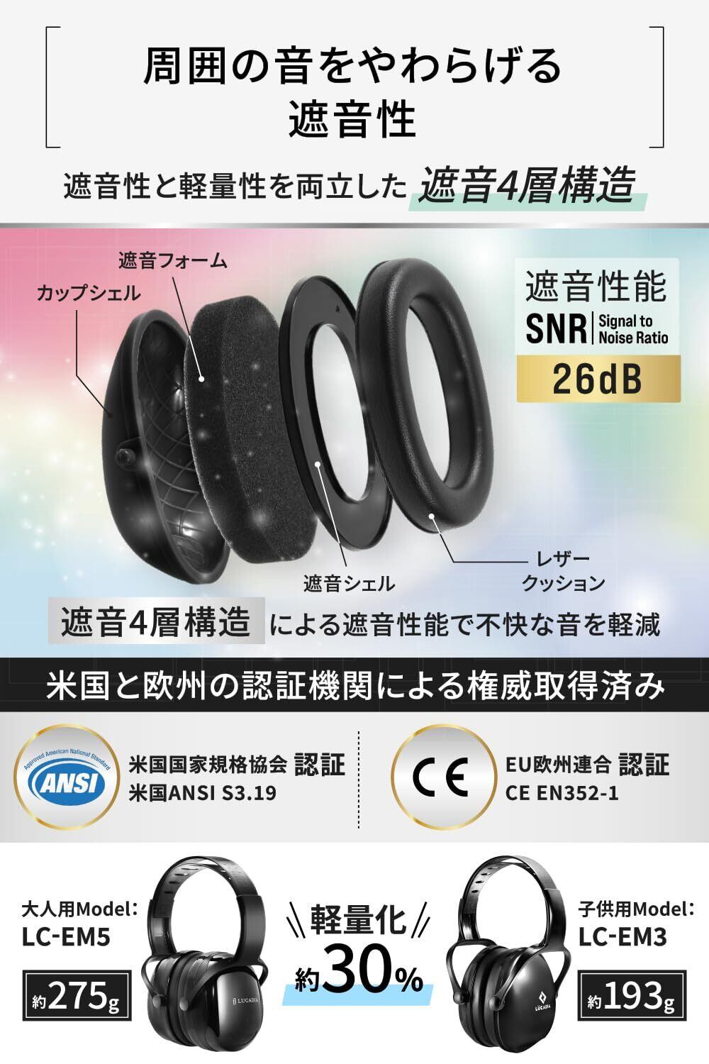 イヤーマフ 防音 子供用 遮音 男女兼用 メンズ レディース キッズ 学生 騒音対策 LC-EM3 ルカディア LUCADIA