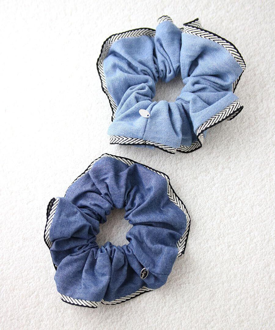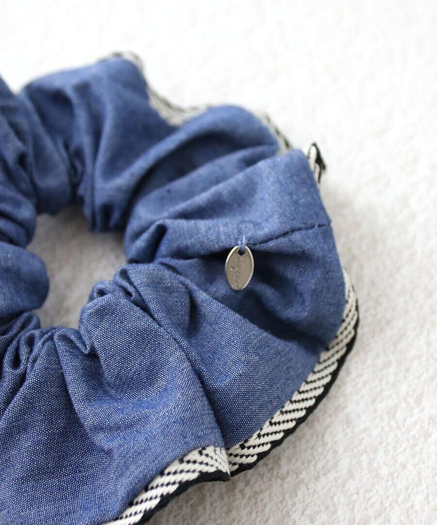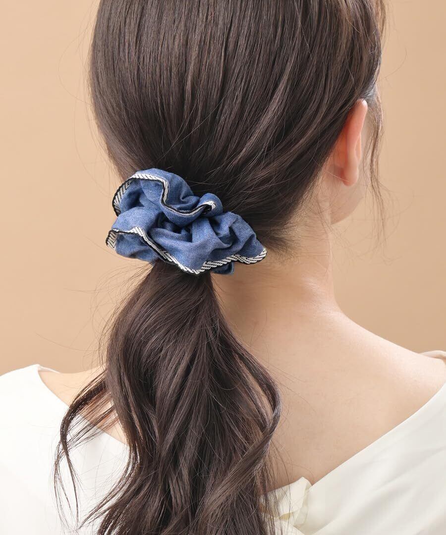 たっぷりボリュームで華やかなヘアスタイルを演出してくれるデニム風シュシュ。縁のパイピングがコーディネートのアクセントにぴったりです。さっとまとめるだけで、程よくフェミニンさもプラスしてくれるので、デイリーに活躍してくれそう!