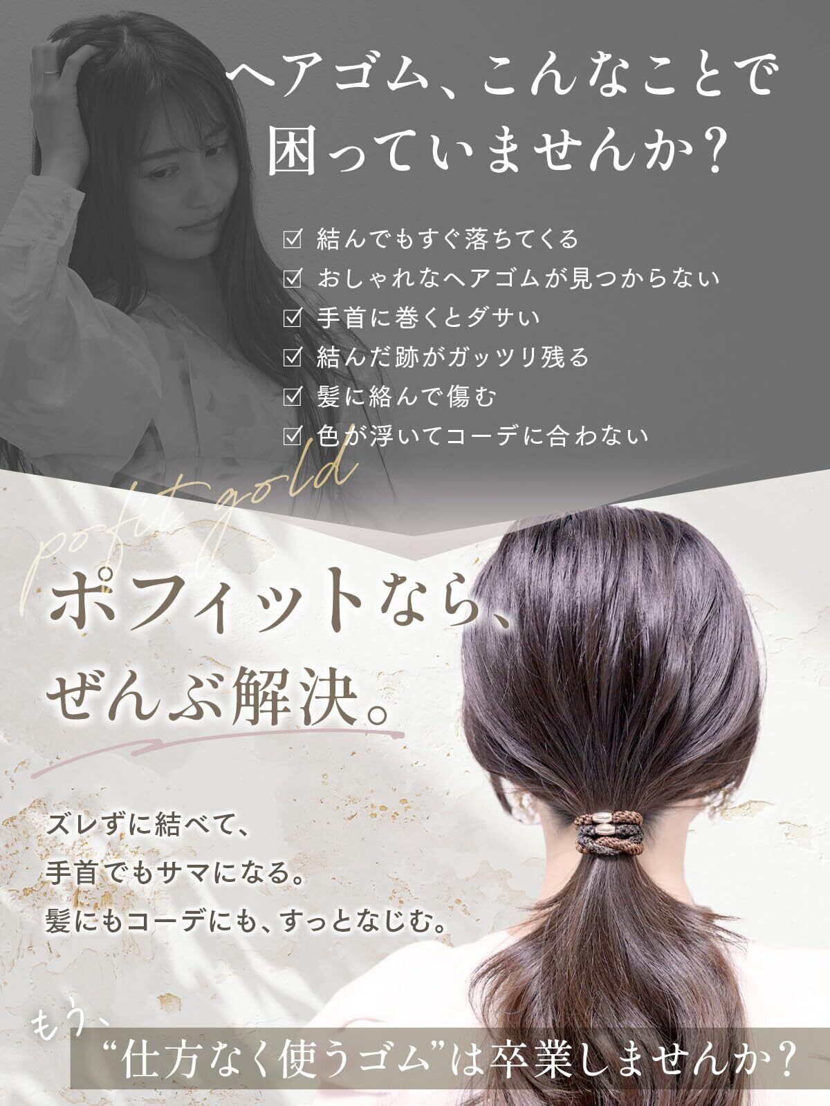 【上質な“ふつう”を楽しむ大人のヘアゴム「ポフィット」】ポニーテール+フィット=Pofit(ポフィット)。“がんばりすぎないおしゃれ”を叶える、アクセサリー感覚のヘアゴム。手首につけても自然に馴染み、日常の装いにさりげなく寄り添います。