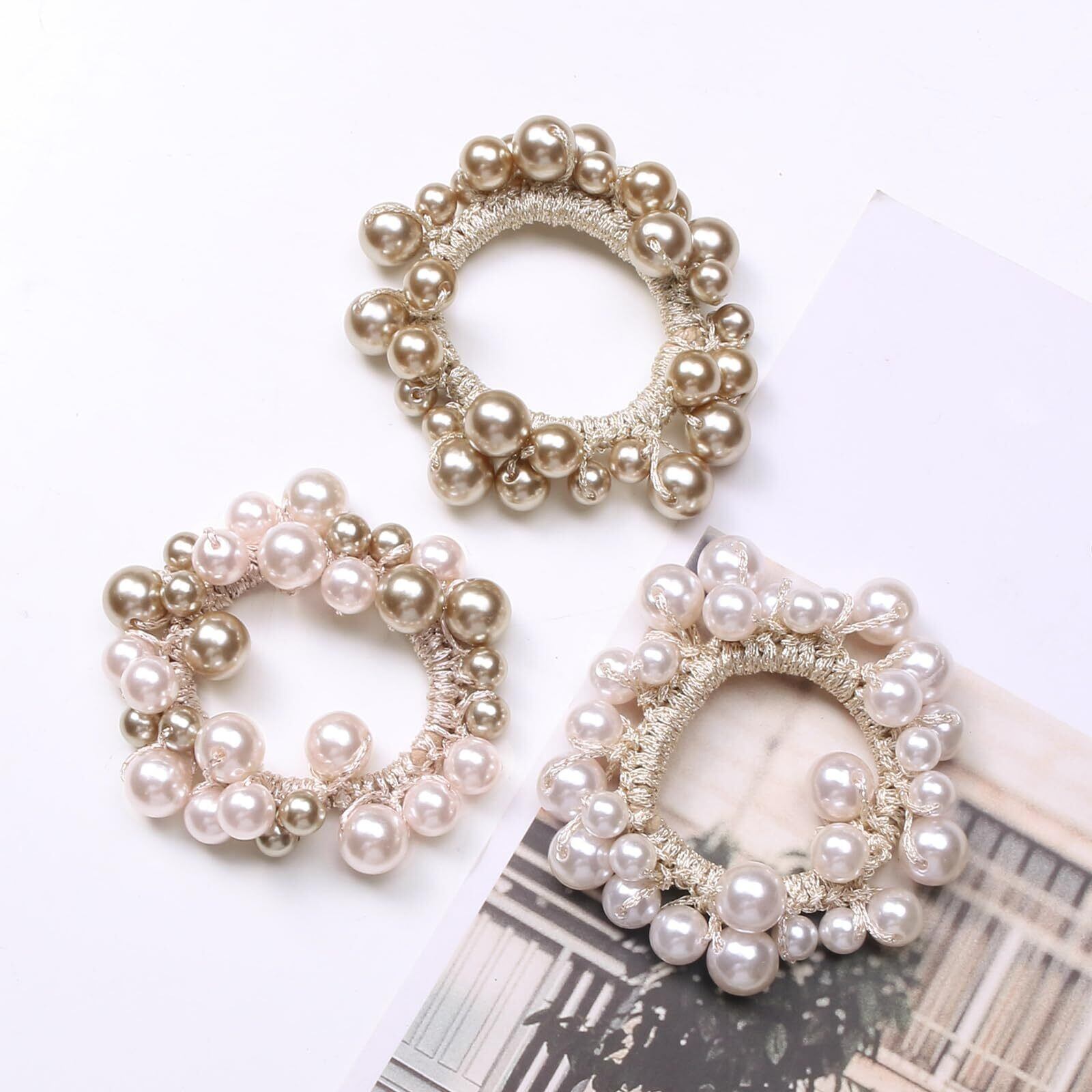 【お得な3色セット】パール ヘアアクセサリーにはベージュ、シャンパン、ピンクの3色があり、気分や服装に合わせて色の異なるパール ヘアゴムを使うことができます。