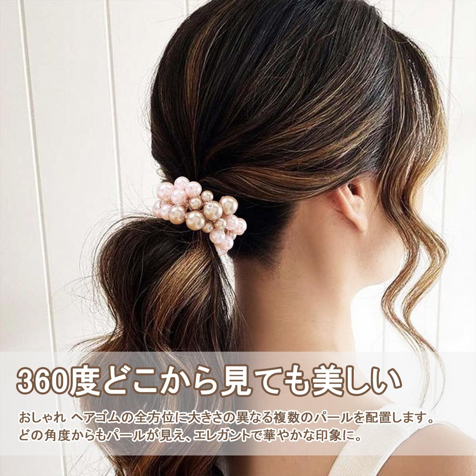 【360度どこから見ても美しい】おしゃれ ヘアゴムの全方位に大きさの異なる複数のパールを配置します。どの角度からもパールが見え、エレガントで華やかな印象に。シンプルながらも存在感のあるデザインです。