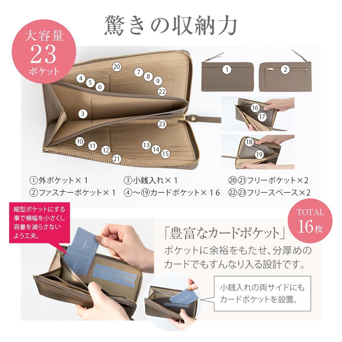 【スペック】 ・小銭入れ × 1 ・フリースペース × 2 ・カードポケット × 16 ・フリーポケット × 2 ・外ポケット × 1 ・ファスナーポケット × 1 【サイズ】 ・縦 100mm × 横 180mm × 厚み 13mm ・重さ 135g 【素材】 ・表側:本革 ・内側:ナイロン