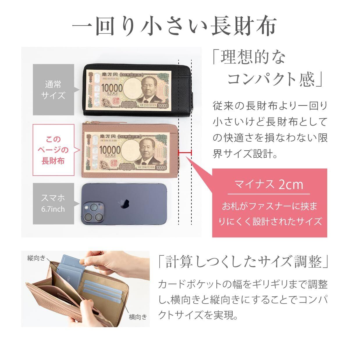 【長財布+コンパクト】 ロングウォレットの快適さを保ちつつ限界までサイズをおさえた、”いいとこどり” のお財布です。約18cmの長さはお札と同等の長さで、短く小さい長財布。小さめバッグに収まるサイズ感ながら、16箇所のカードポケット+4つのフリーポケットを配置。お札も折らずに入ります。
