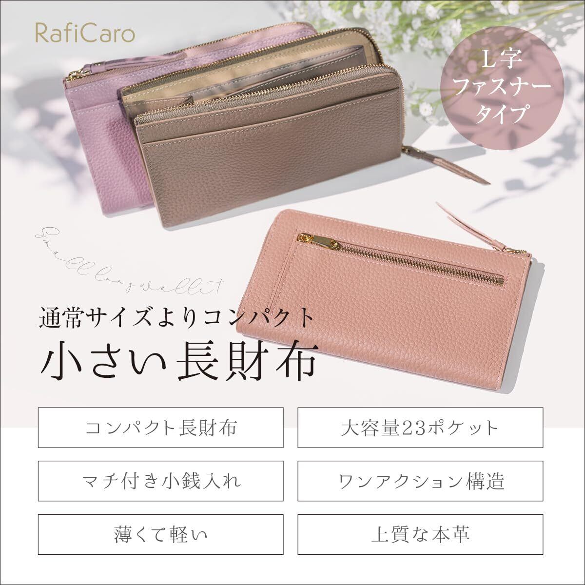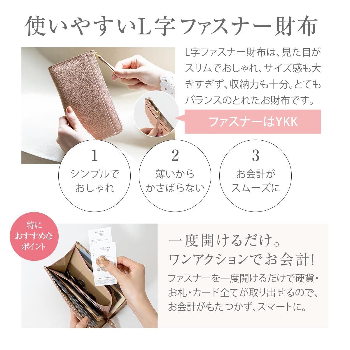 【素材にもこだわり】 表地には上品で優しい手ざわりの本革シュリンクレザー、ファスナーは安心のYKK製。独自のマチ構造で取り出しやすい小銭入れ。ワンアクションでお札・小銭・カードにアクセスできるので、お会計もスムーズです。