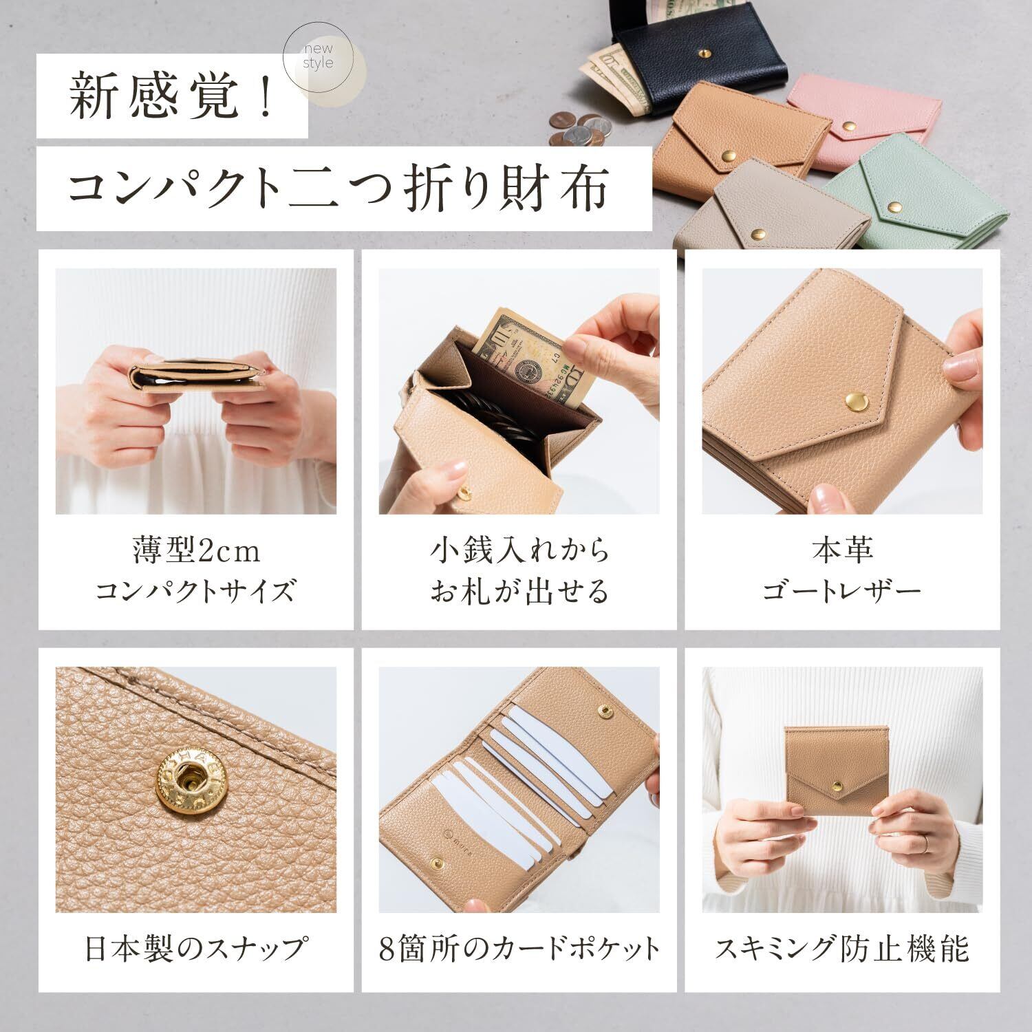 【小銭入れからお札が取り出せる新しい財布のカタチ 支払いがもっと楽に、あなたの毎日をサポートする ゴートシュリンクレザースナップボタン 二つ折り財布】小銭入れからお札を手軽に取り出す新デザイン。 コンパクトながらカードポケットを8枚収納可能でクレジットカードやポイントカード、身分証明書など ついついかさばるカード類を整理したい方におすすめです。 さらにスキミング防止機能付きで安心して使用できるゴートシュリンクレザースナップボタン 二つ折り財布。