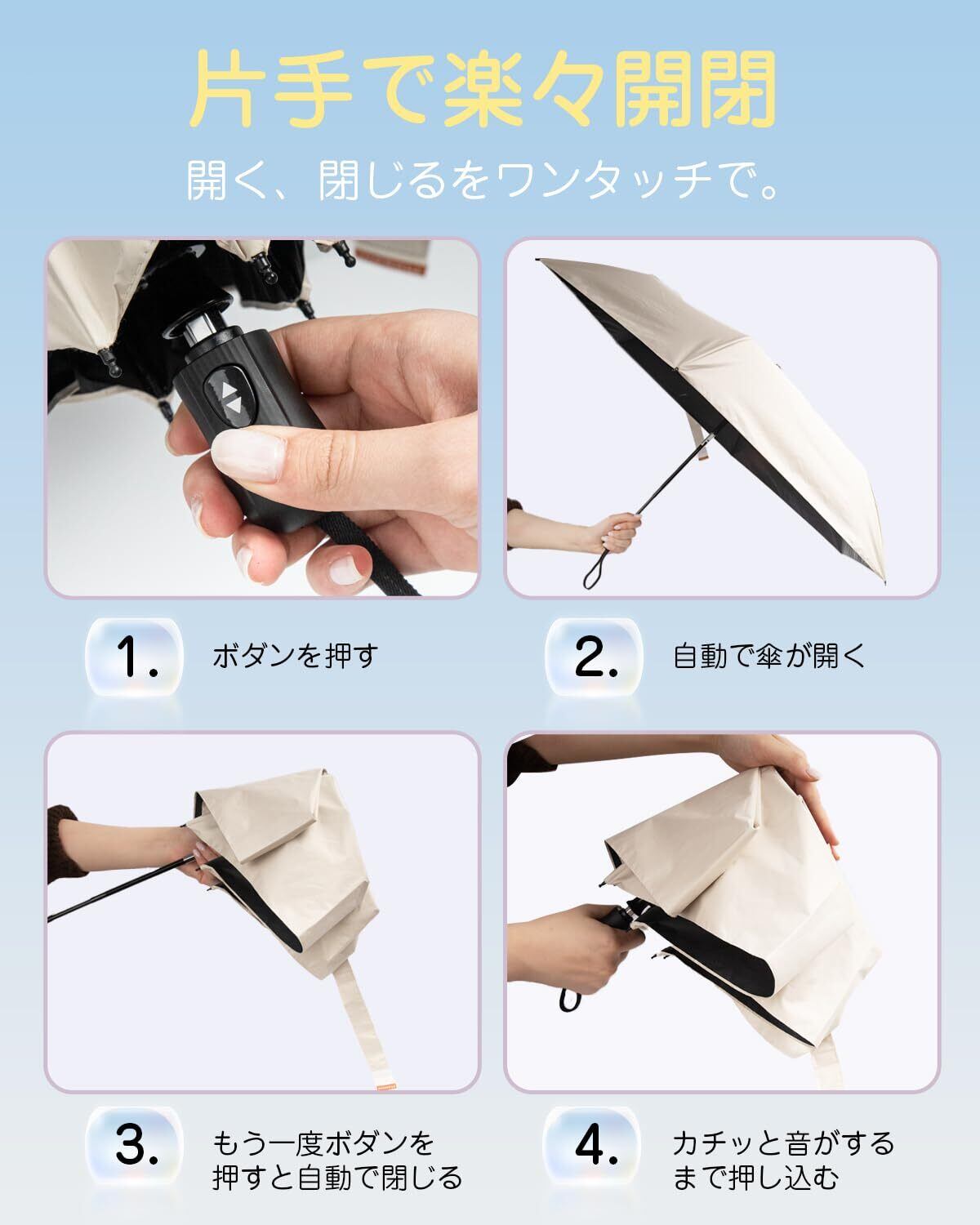 【自動開閉おりたたみ日傘】ボタン一つで操作できるワンタッチ自動開閉機能を搭載した自動開閉おりたたみ日傘。荷物が多い時や車の乗り降りでも片手でスムーズに開閉できます。完全遮光・UVカット率100%・紫外線遮断性能を備えた日傘で、日差しの強い季節も安心。折りたたみ傘としてバッグに収納しやすく、夏用の紫外線対策グッズとして毎日使える折り畳み日傘です。外出時も快適に持ち歩けます。