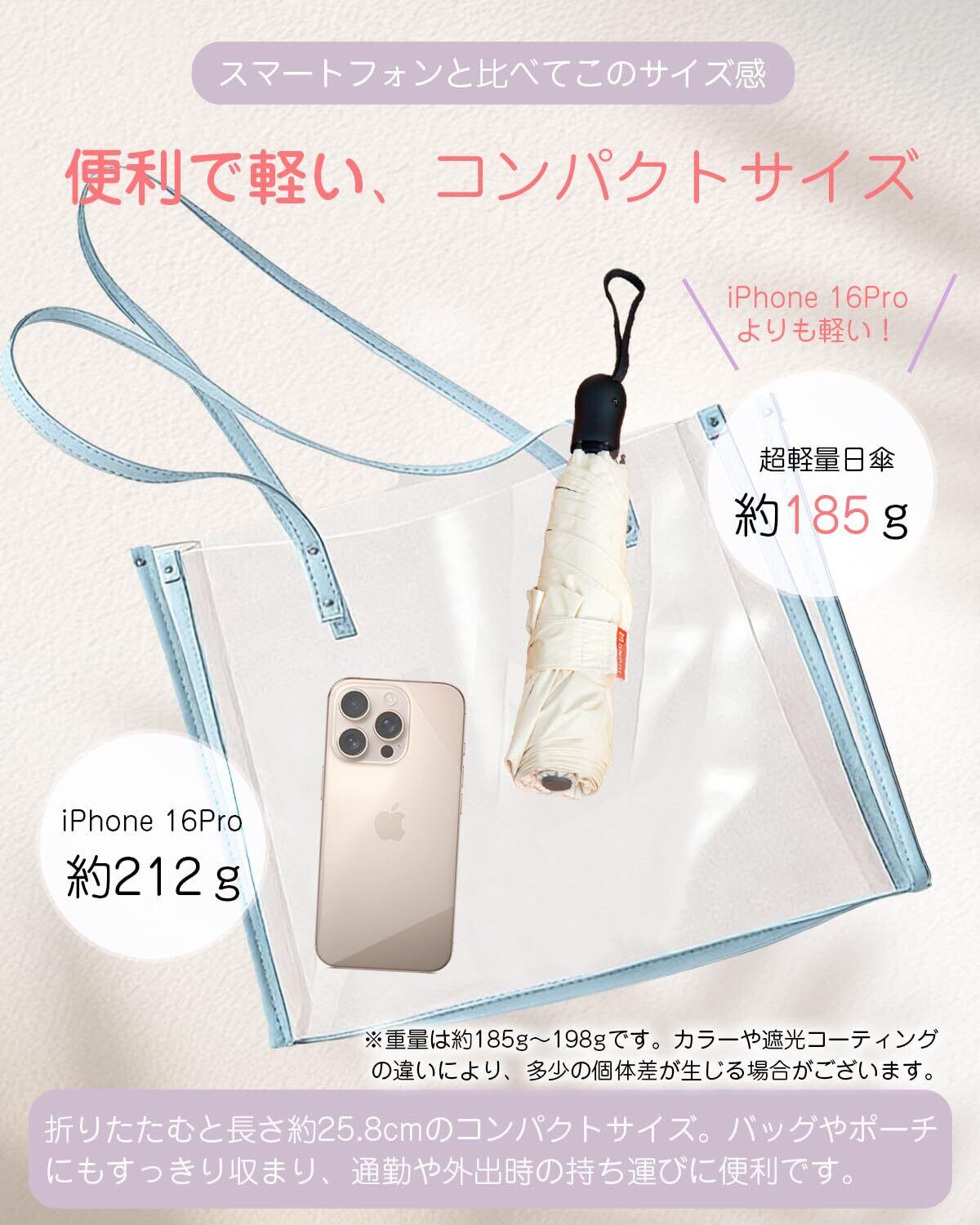 【超軽量*携帯便利】約185gの超軽量設計を実現した折り畳み日傘。コンパクトサイズでバッグに収まり、毎日の外出でも携帯便利。生地は細やかで上質な質感を持ち、完全遮光・UVカット率100%・UPF50+性能を備えた日傘です。外出先でも快適に紫外線対策ができ、レディース・メンズどちらにも使いやすい男女兼用デザイン。通勤・通学・旅行など幅広いシーンで活躍する折り畳み日傘です。